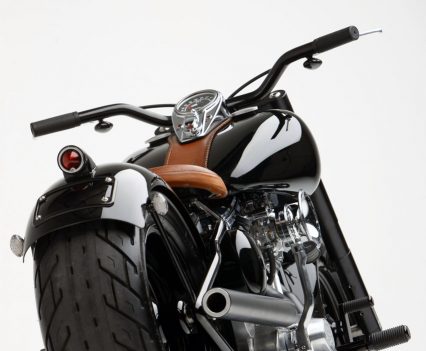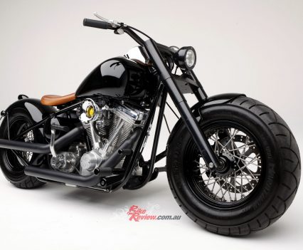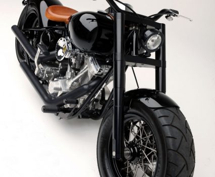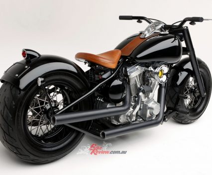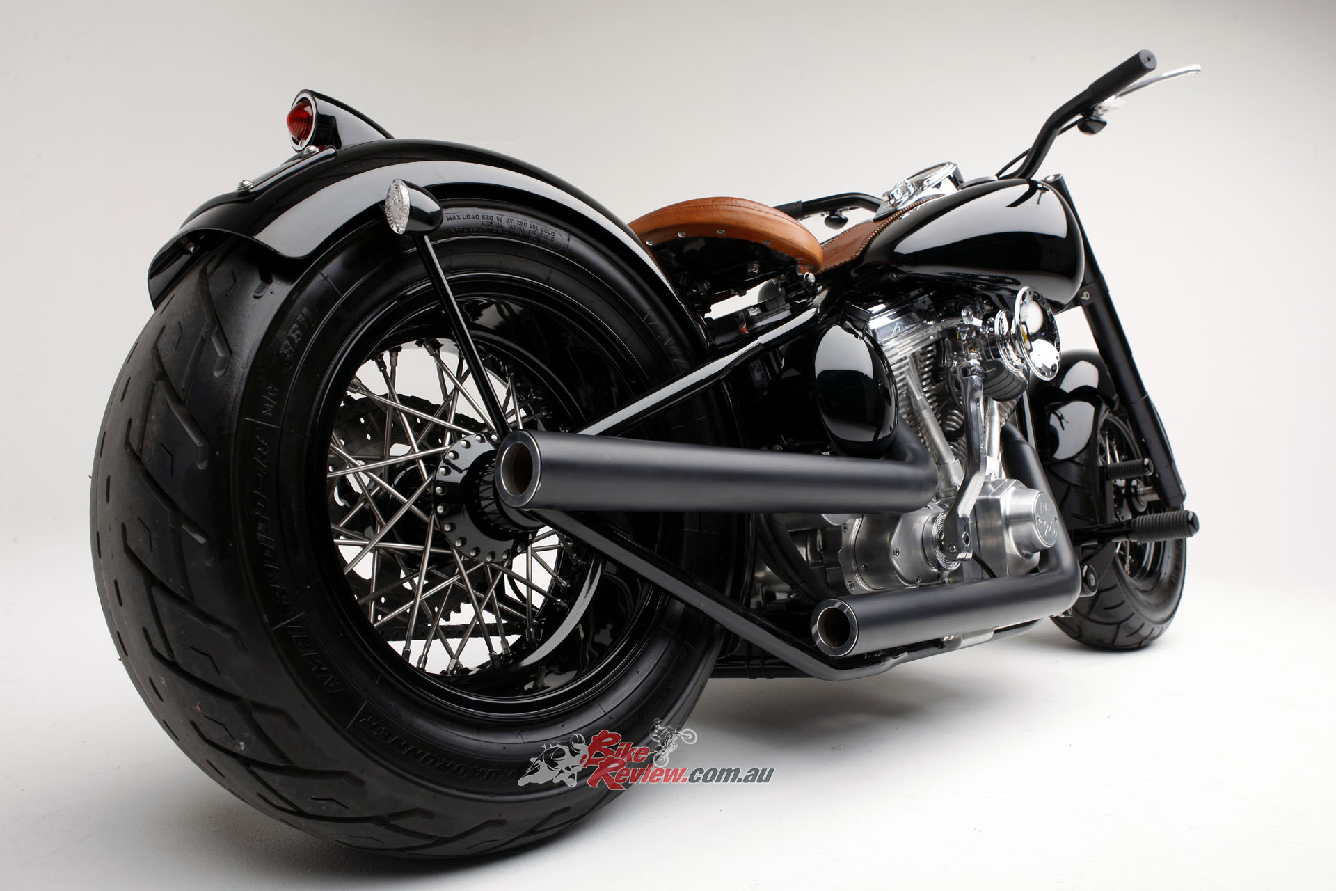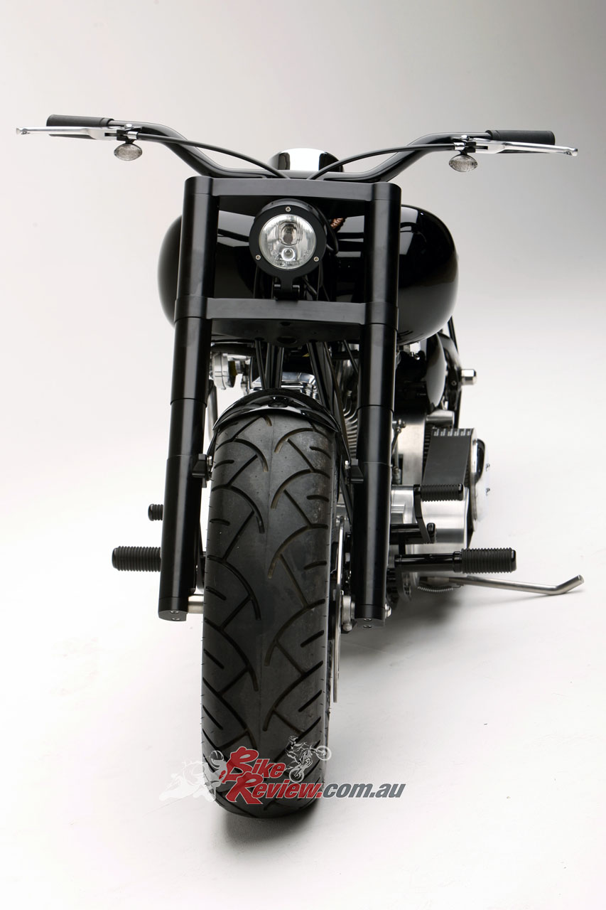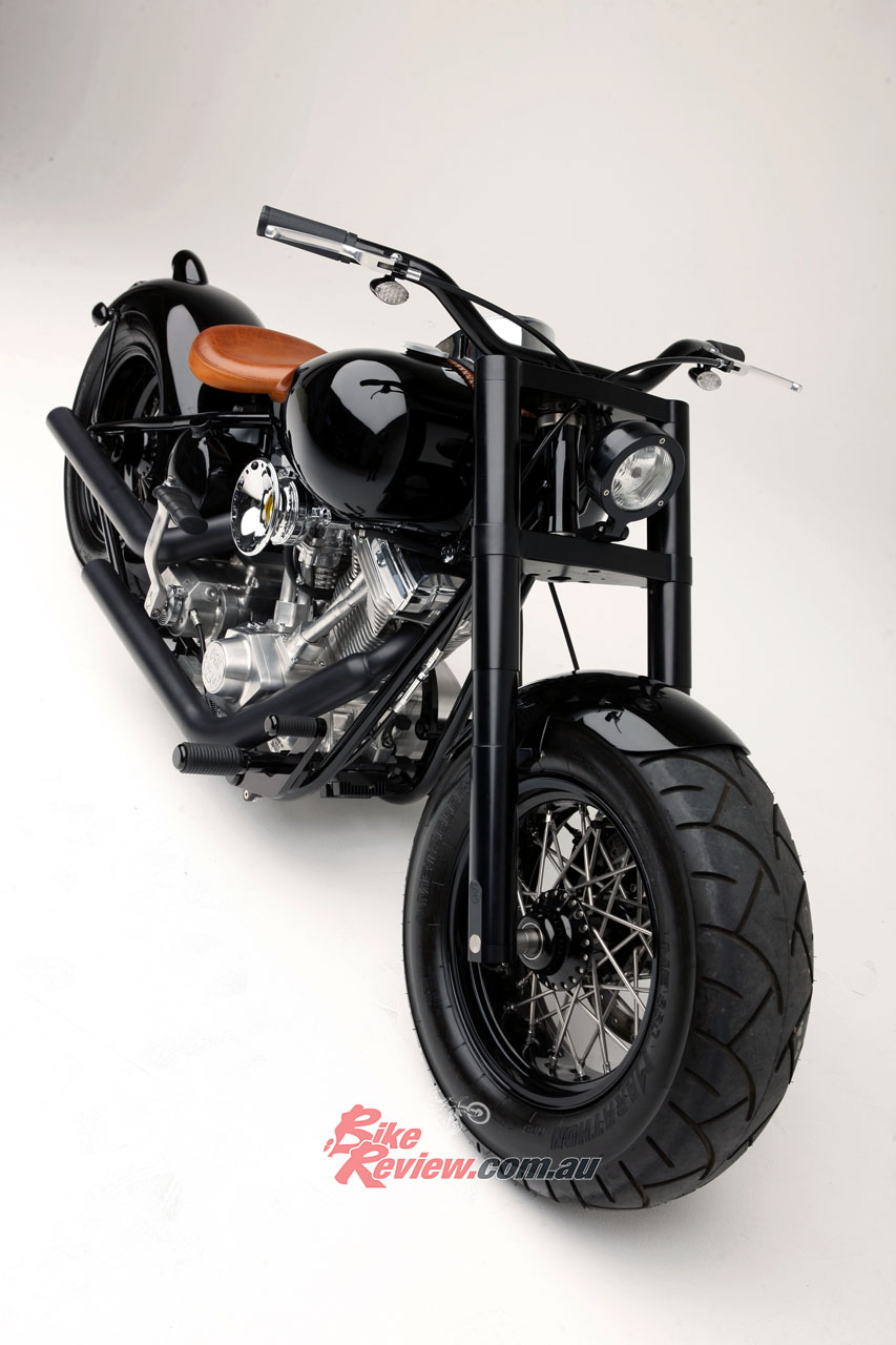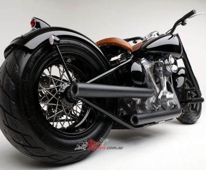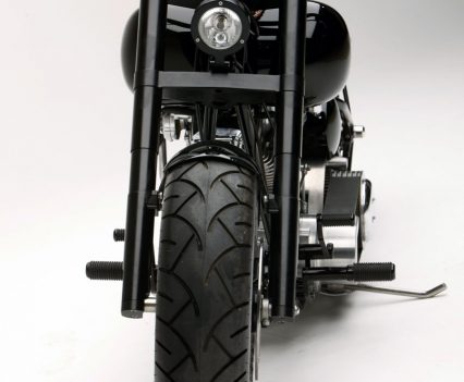 Fuel tanks are 6-gallon Fat Bob’s divided by the H-D speedo-tacho. The tan leather covered seat is Exile Cycles spring mounted from Le Pera. And there’s a stack of black anodising throughout this high gloss black finished ride. It’s a ready ride that will no doubt turn heads for all the right reasons. But for now…Jurgen intends to make some miles!