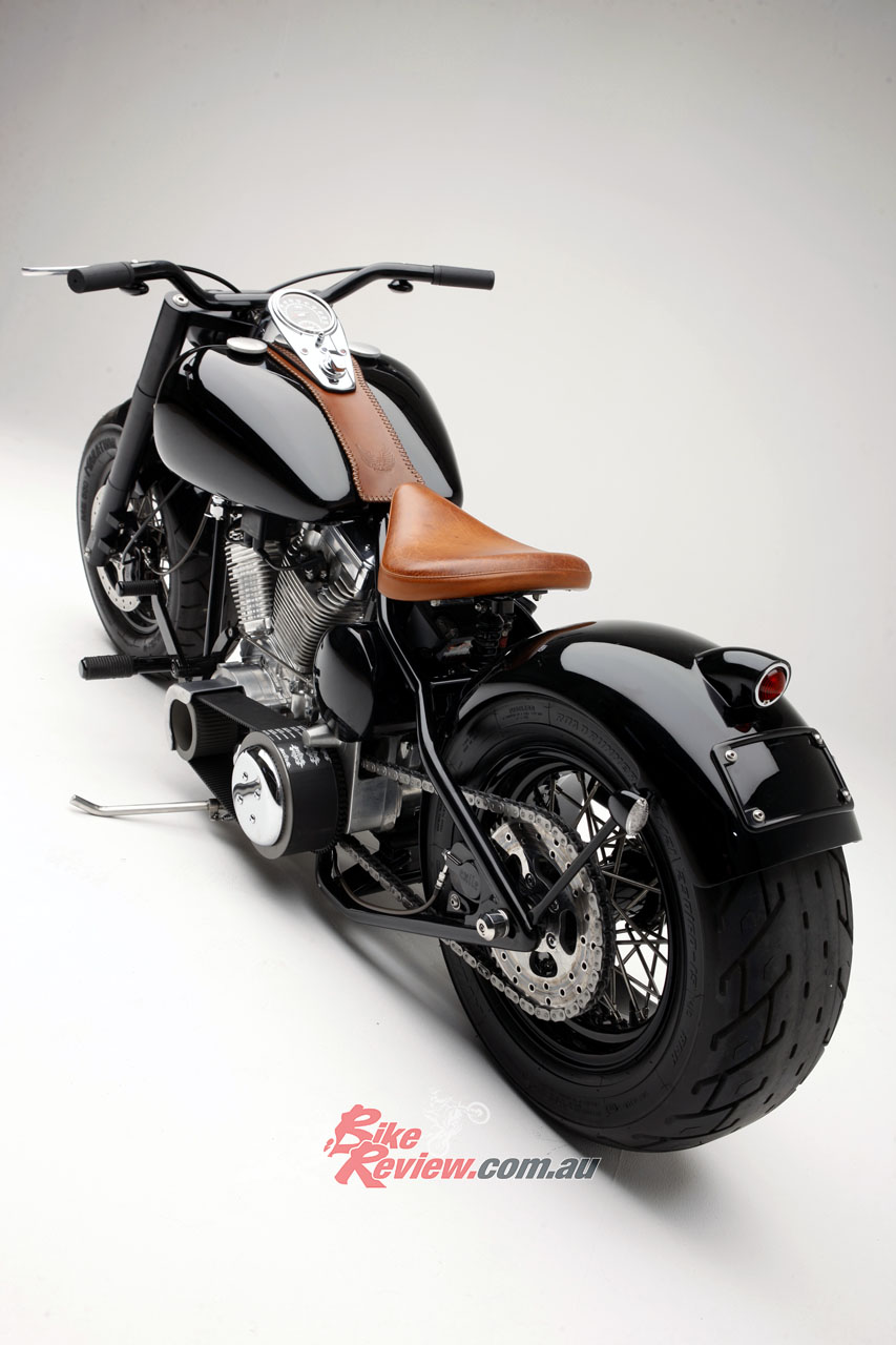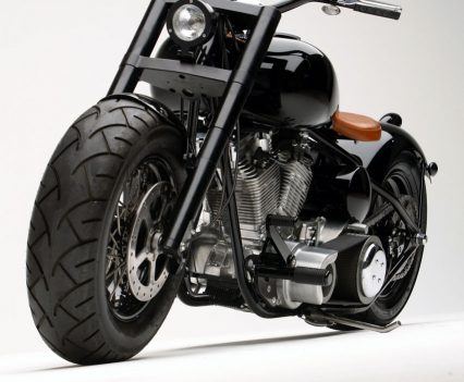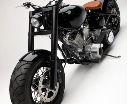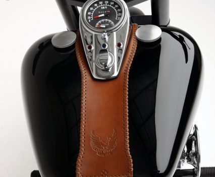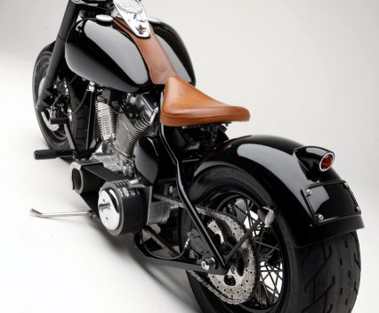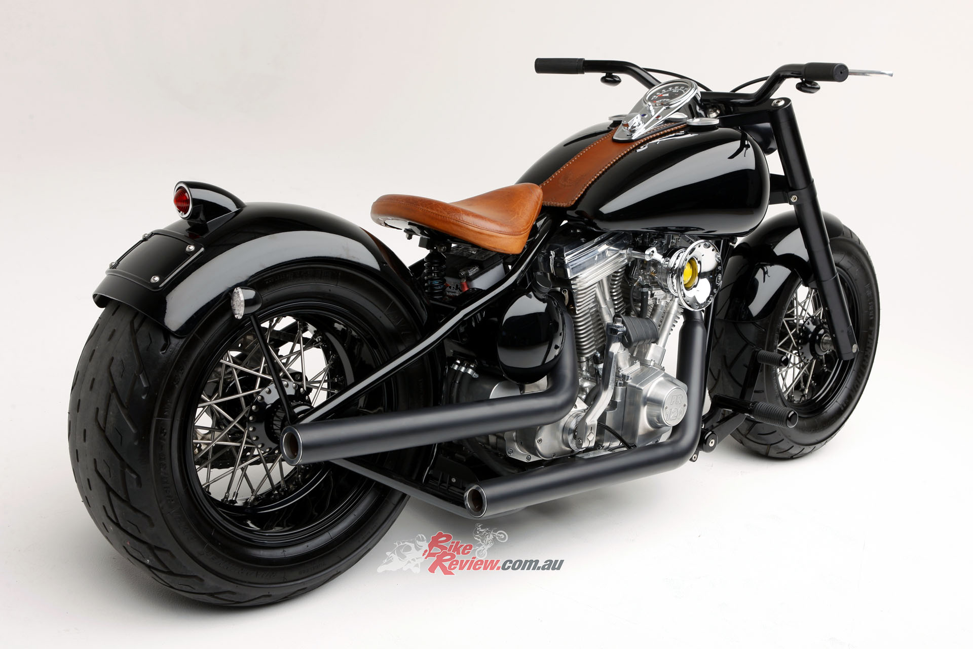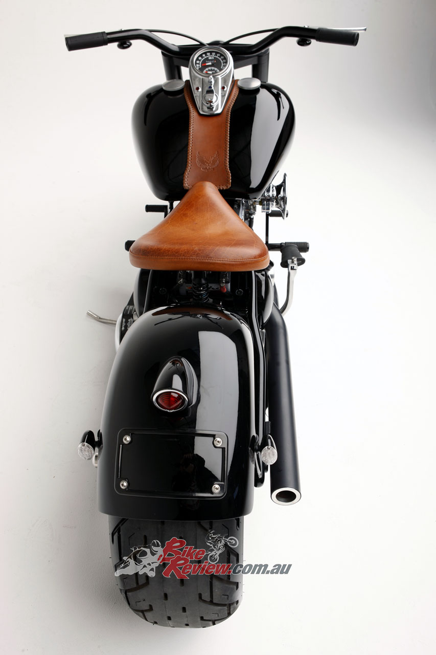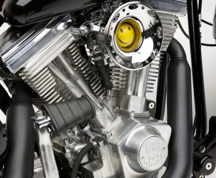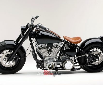 Fuel tanks are 6-gallon Fat Bob’s divided by the H-D speedo-tacho. The tan leather covered seat is Exile Cycles spring mounted from Le Pera. And there’s a stack of black anodising throughout this high gloss black finished ride. It’s a ready ride that will no doubt turn heads for all the right reasons. But for now…Jurgen intends to make some miles!