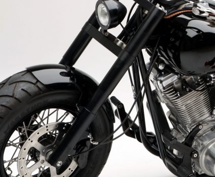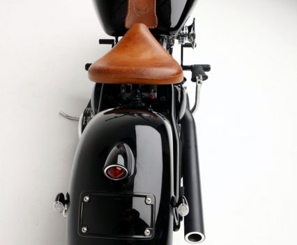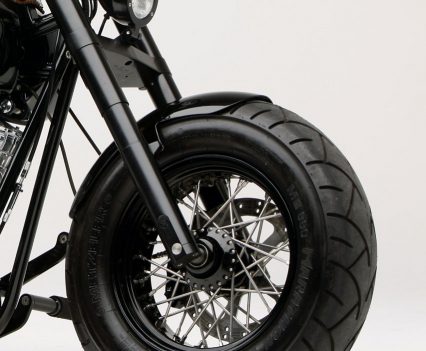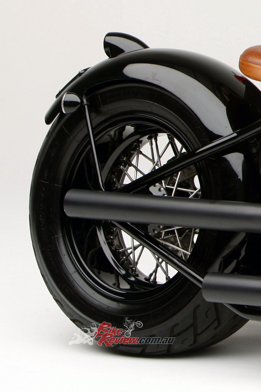The SPJ front-end is an extra wide fat glide 300; headlight is 3.5in diameter also from SPJ. Bars are known as Fat-Wide being 1.25in thick. They are accessorised with Grip Ace levers and grips. The guards accommodate the fat rubber which is more from Exile Cycles; the rear has a Sparto taillight.