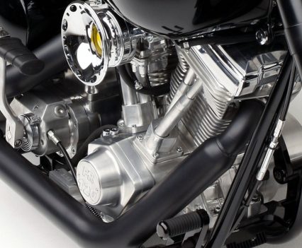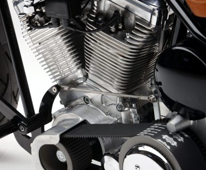 Things like a Fat Chrome velocity stack, Techcycle 2.0Kw starter motor, custom exhaust, Jims 6-speed gearbox, Barnett clutch, Rivera Primo-3” belt were added to the Patricks Racing engine.