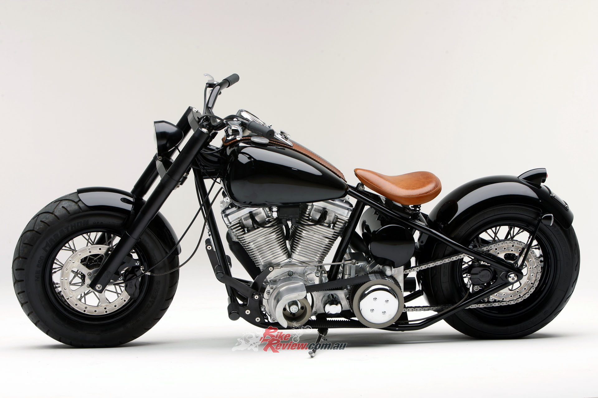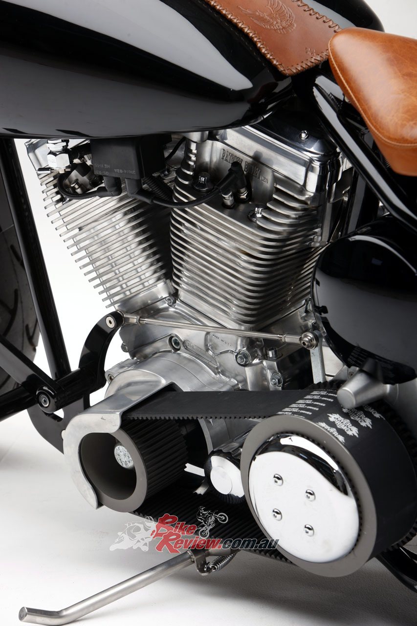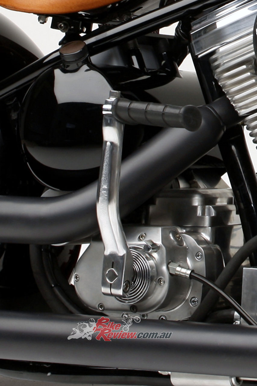 ENGINE: Patricks Racing-Satin 120 Cubic Inch with dual Fire electronic ignition, four-stroke, Mikuni 45mm carburettor, Fat Chrome velocity stack, Techcycle 2.0Kw starter motor, custom exhaust, Jims 6-speed gearbox, Barnett clutch, Rivera Primo-3” belt.