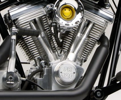 “The frame is a rigid Daytec custom build that cradles the 120 cubic inch PR engine fitted with a 45mm Mikuni carburettor feeding the fuel.”