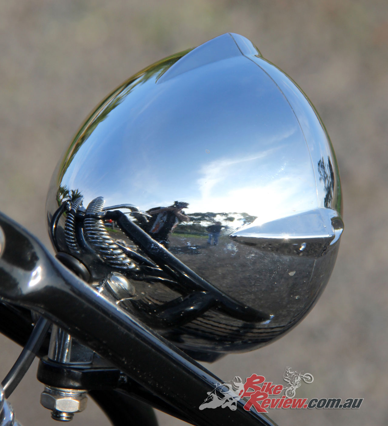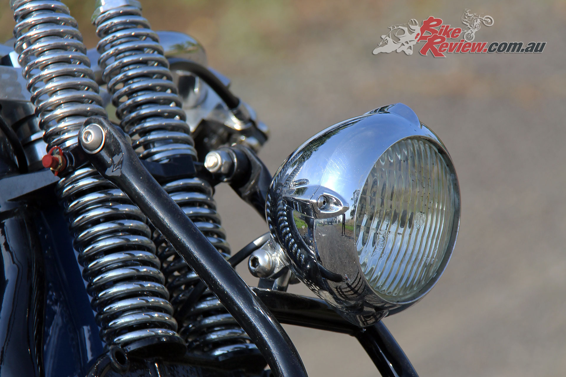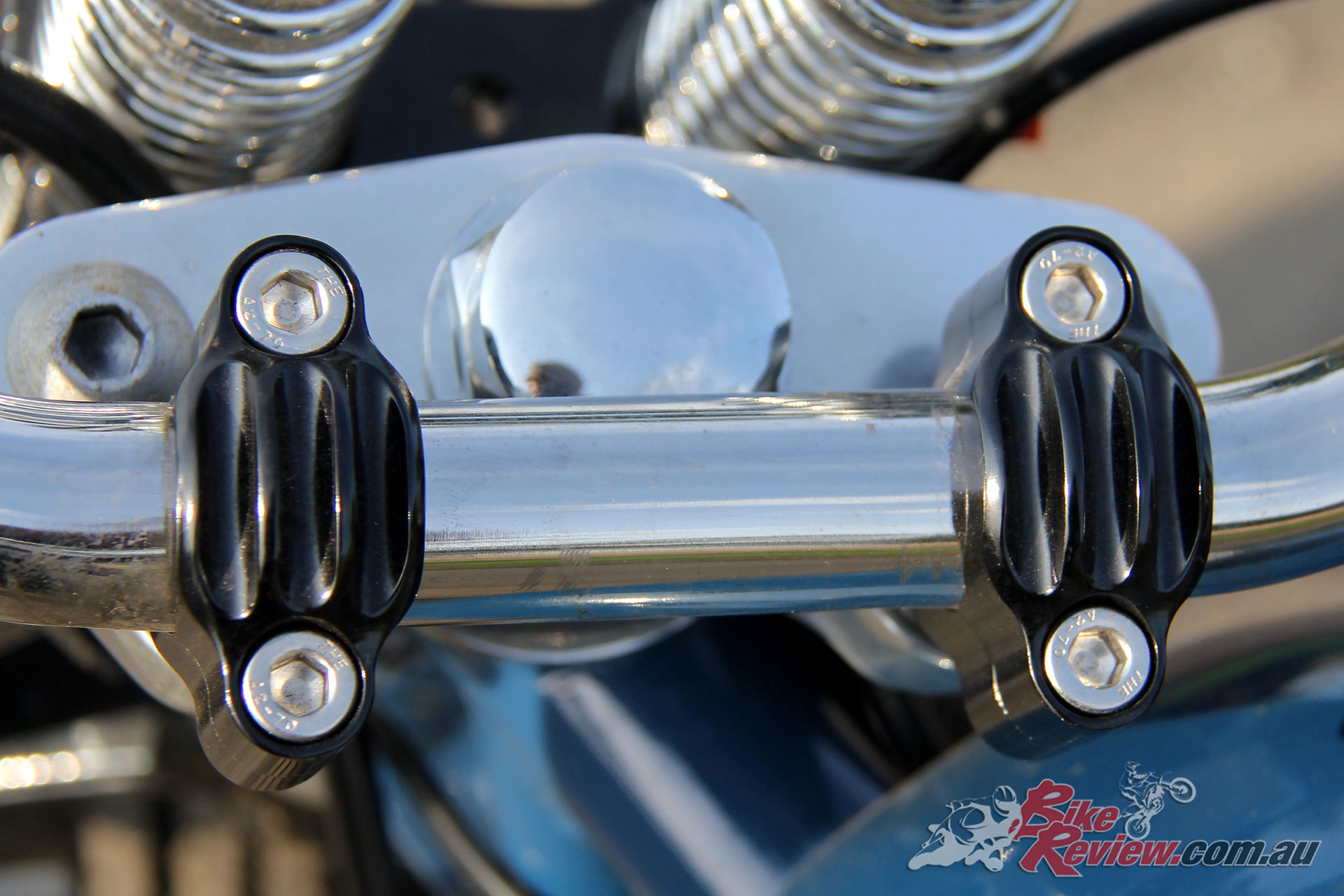 A set of billet aluminium risers in black hold the custom bent ‘bars by Luke of G. Works Custom Cycles in Geelong, who also took care of all the wiring for this build.