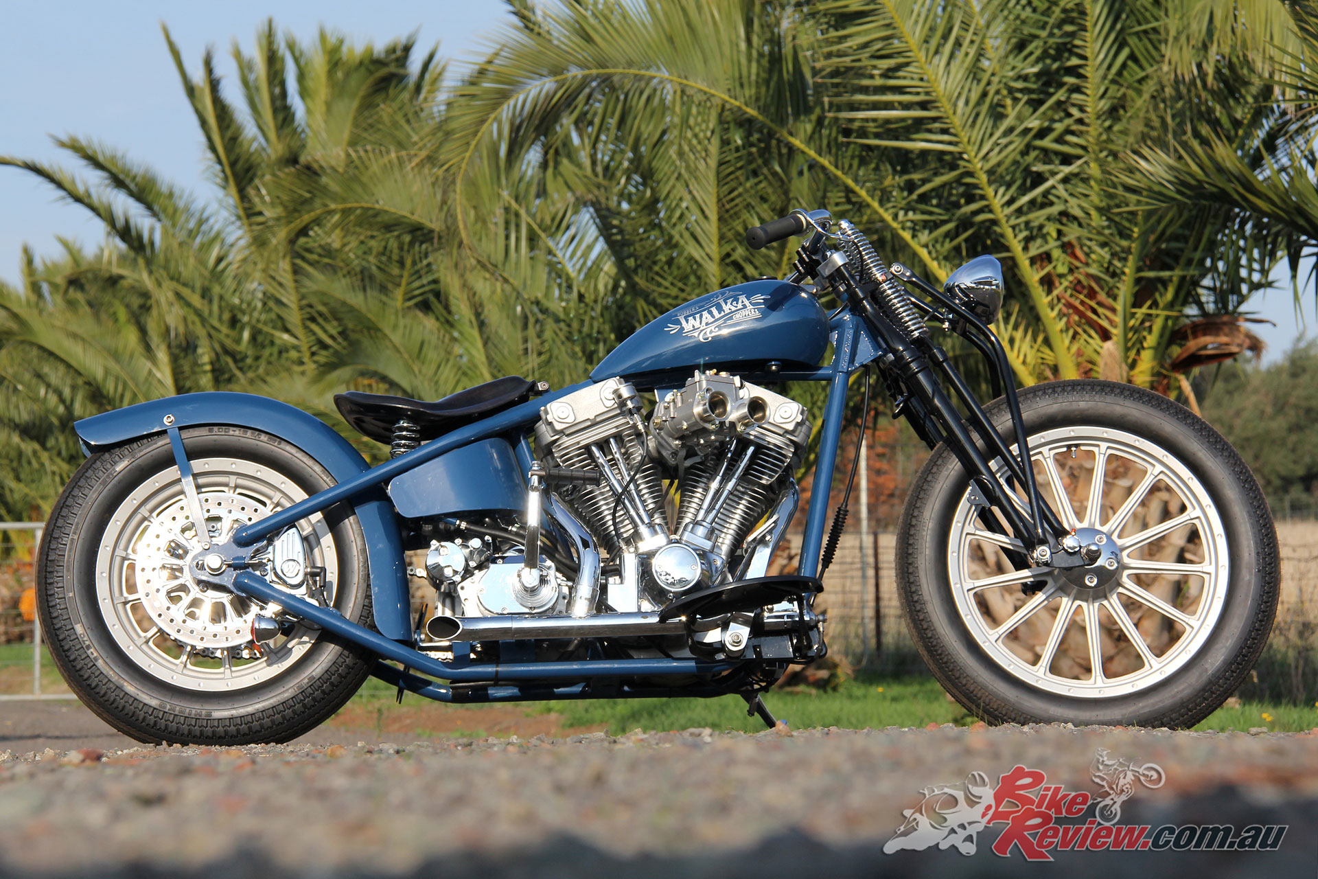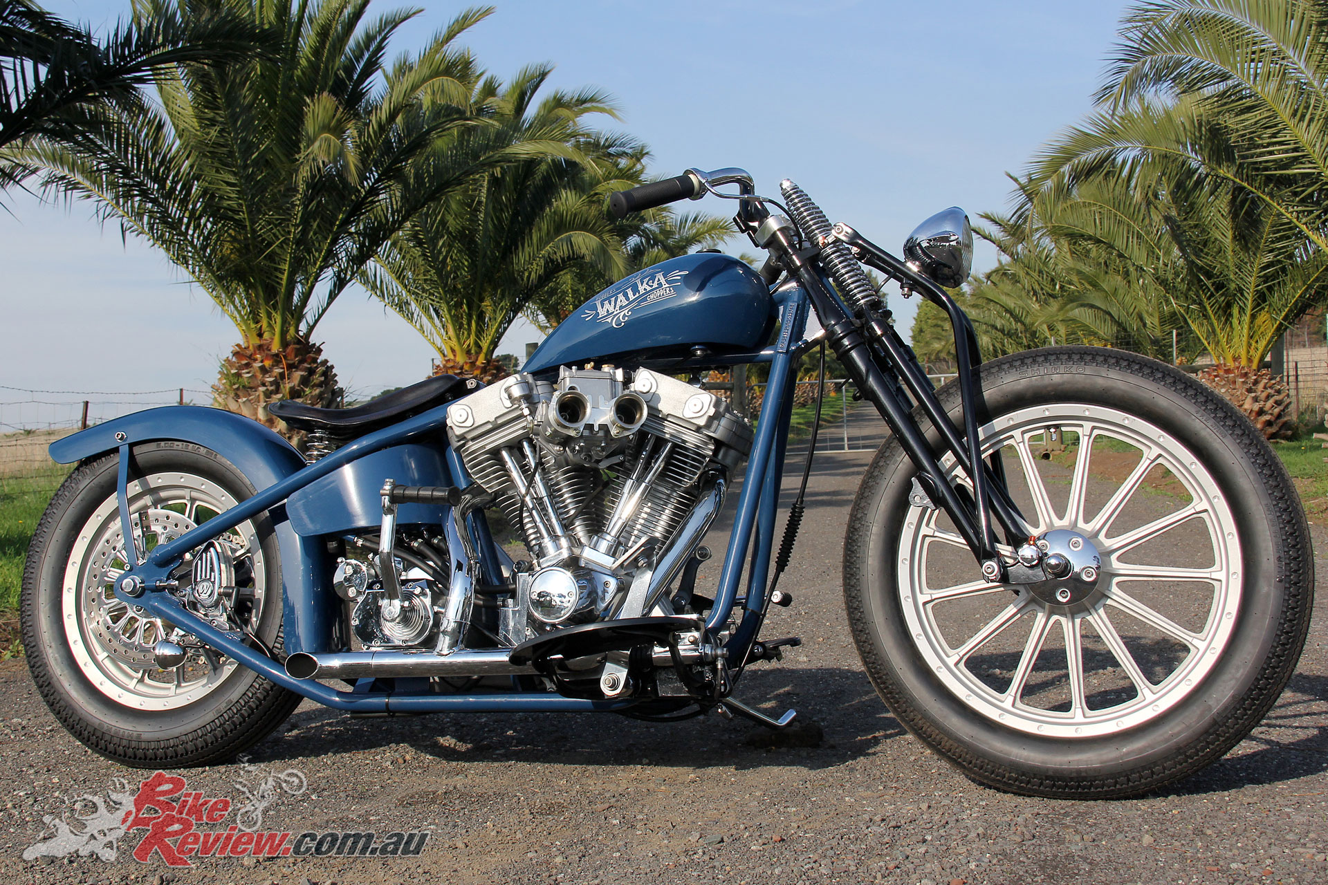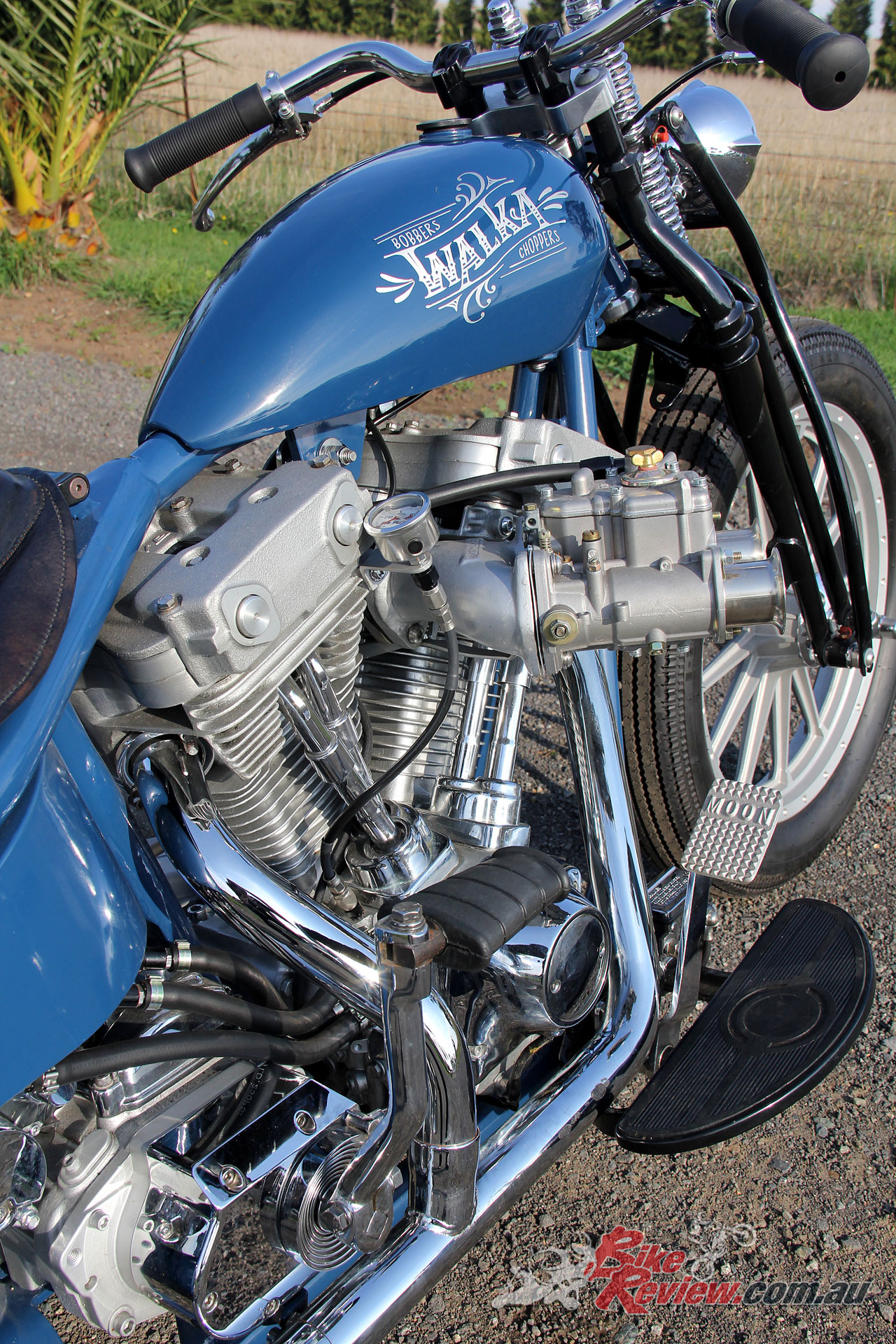 Capping off the powerplant is a Paughco two-into-one exhaust system, which – you guess it – was also modified to suit, with Walka trimming 12in off the length and adding a Baffled Turnout Tip from Moon, which he’d picked up on a trip to Japan, and ensures the bike had plenty of bark.