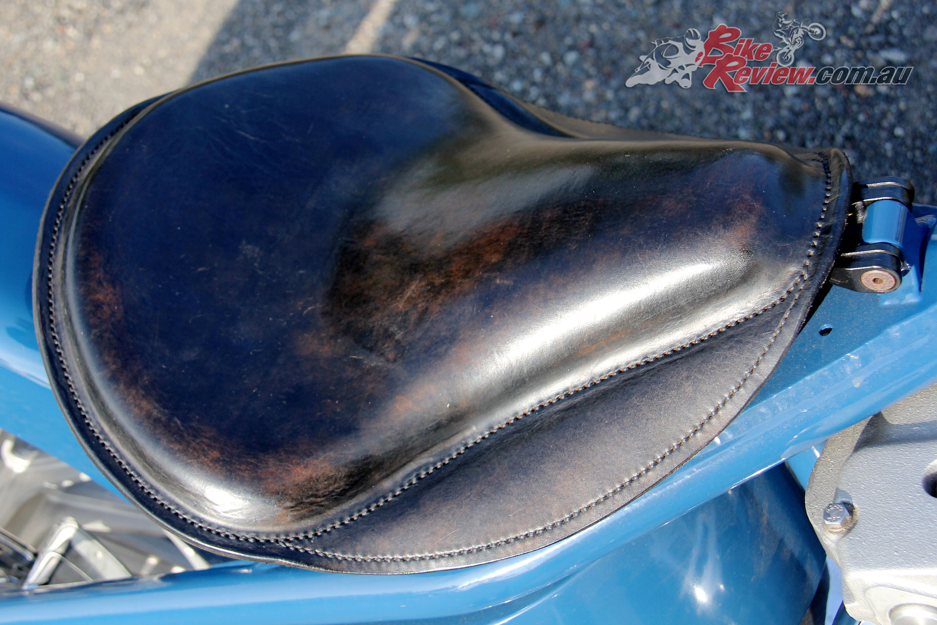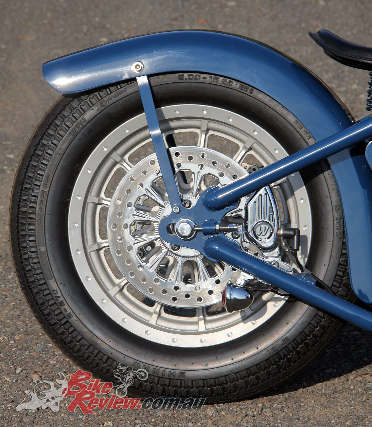 With the rear guard Walka originally started with a rounder profile that more closely followed the wheel, however changed his mind and went with the current item fitted, which straightens out at the rear, while offering close clearance to the tyre, helping accentuate the wheel. The guard is finished in Navy Blue, and rather than mar the guard with a taillight it’s mounted to the underside of the frame at the rear wheel.