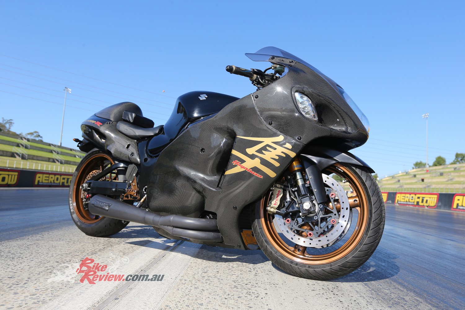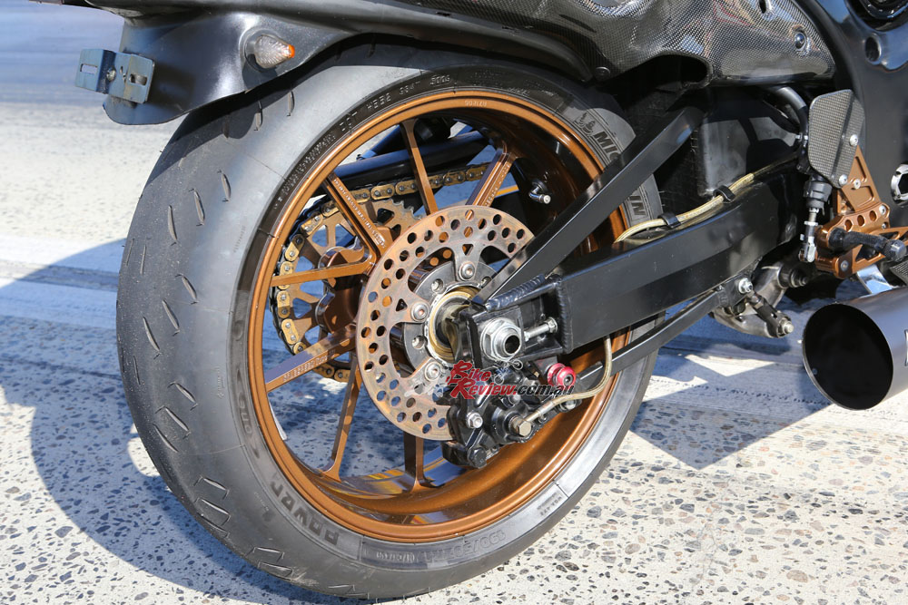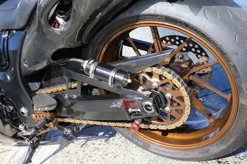 The stunning bodywork is what really sets this bike off. The clear coated carbon glass looks fast just standing still and the gold wheels and custom decals, along with the black sidewinder, look seriously tough.