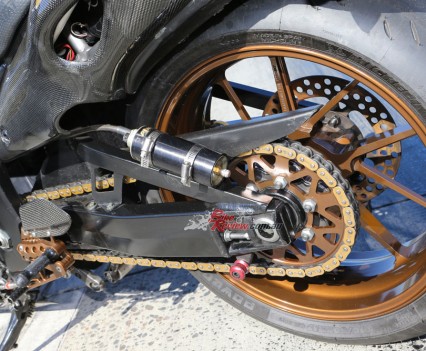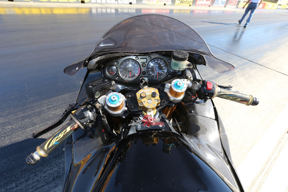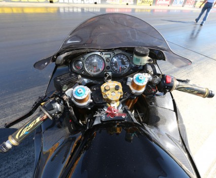 The forks were replaced by Ohlins units which were sent to Zenodamper to be set-up specifically for drag racing. Zenodamper also built the custom shock for the eight-second bike using a Penske base with Zenodamper internals. The fork springs are 1.05kg and the rear spring 550lb. The bike is lowered via adjustable dogbones and has an extremely low centre of gravity, as you can tell by the images.