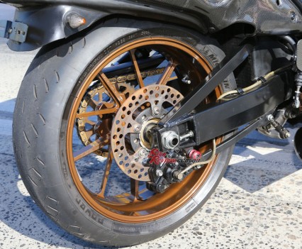 The standard front wheel was retained for weight purposes to help keep it on terra firma. BrakeTech full floating ductile iron rotors were fitted and are squeezed by Brembo two-piece radial-mount four-piston calipers. A Brembo radial-pull master-cylinder is used with a 19/18 piston and ratio.