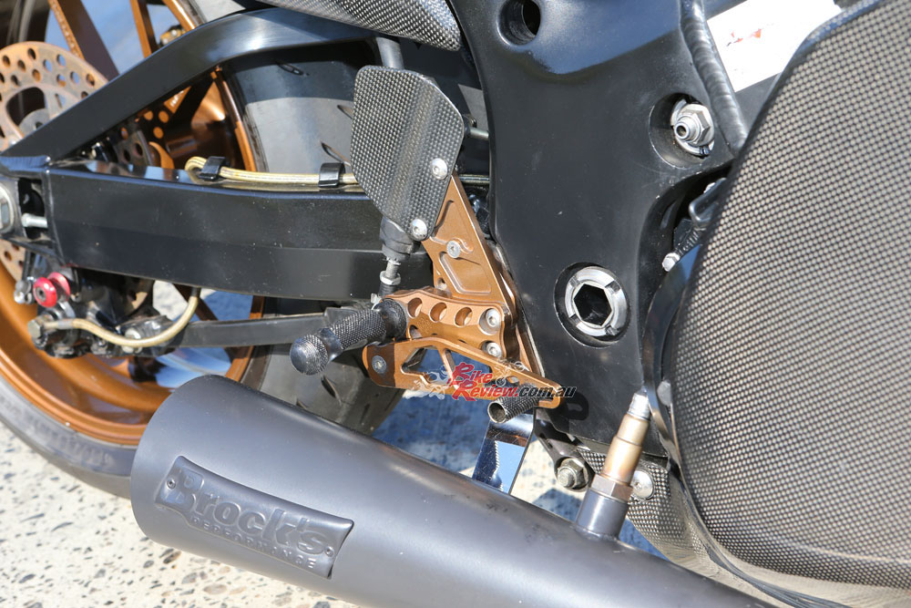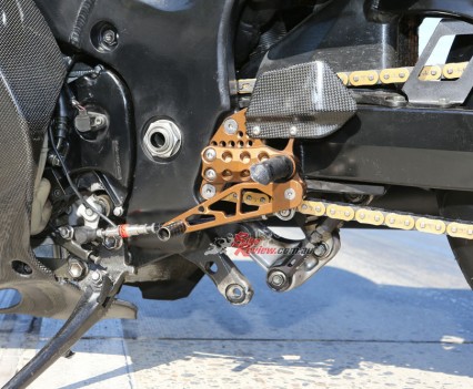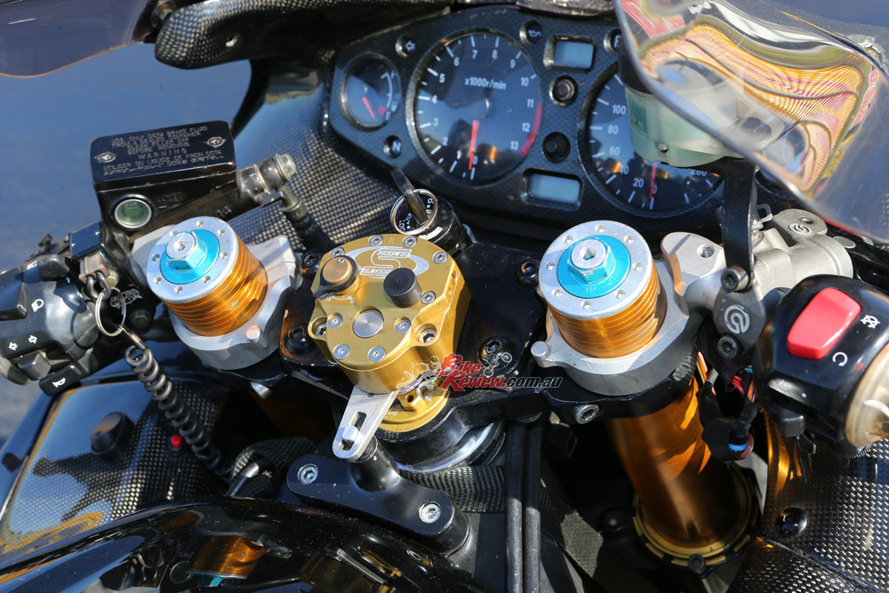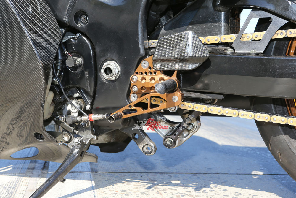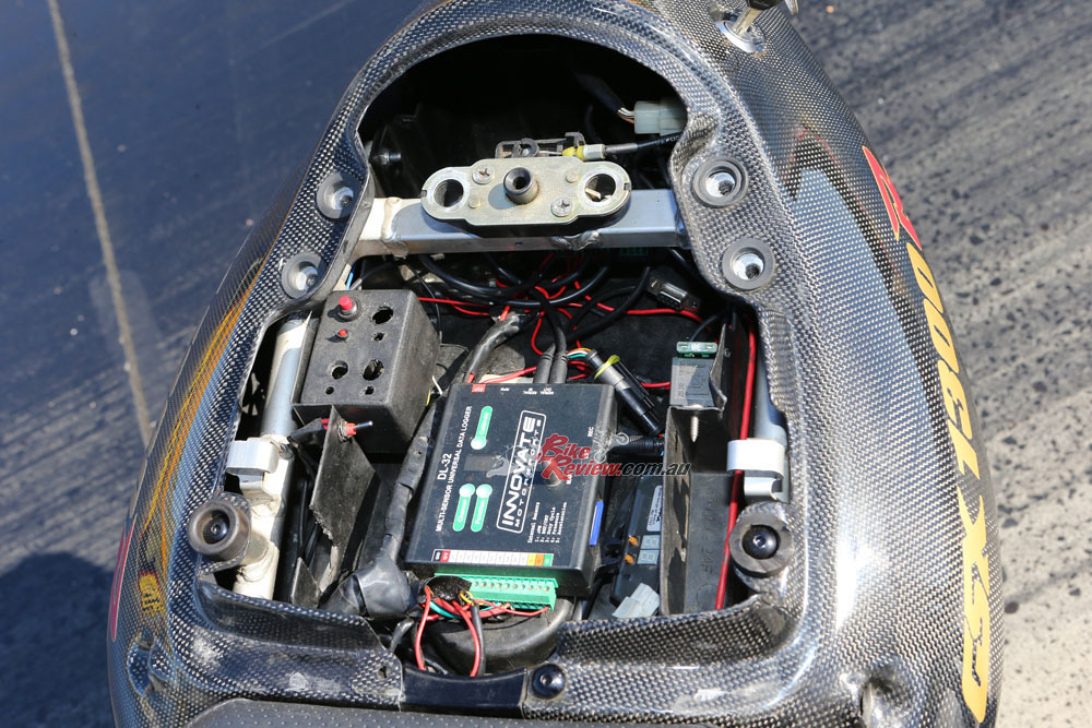 Glenn tuned the bike to run on VP 109 fuel and uses a data logger to flash tune with RomRaider and an ECU editor. The standard airbox was replaced with a carbon-fibre IM Composites unit. To help with clean, fast and accurate shifting, a Quicklapper quickshifter was added.