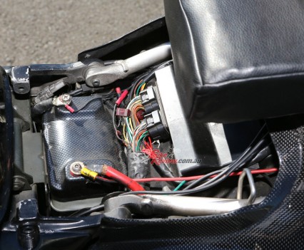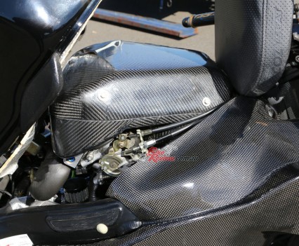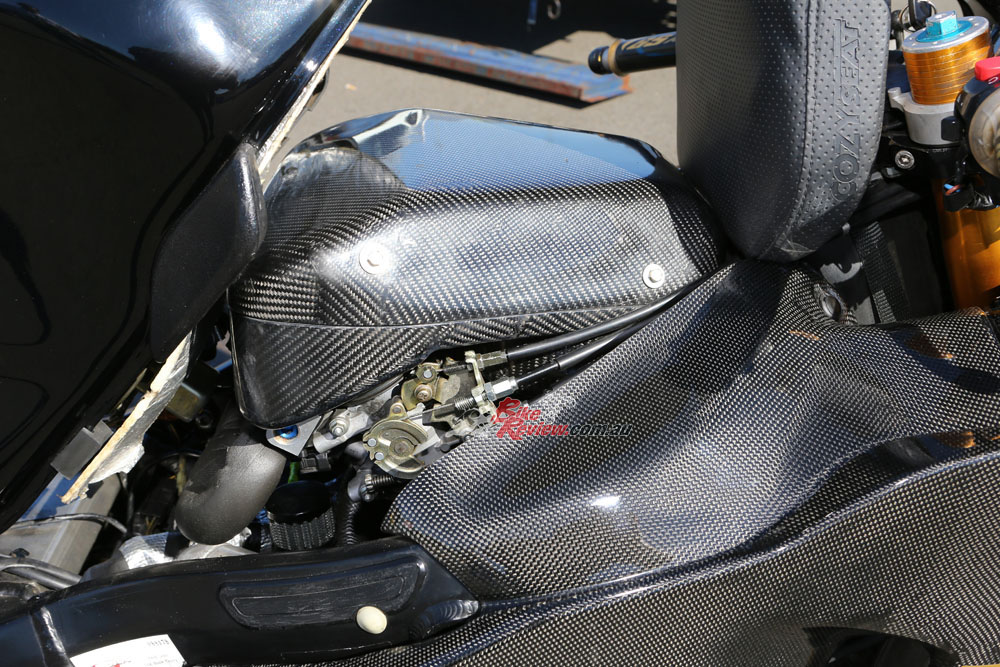 So what kind of goodies are hiding behind that luscious carbon glass? For a start the engine is pure balls – you just can’t beat cubes. This one has a custom billet Marine Crankshafts stroker crank, adding a whopping 5mm of stroke and taking the bike out to 1507cc with the 84mm bore. CP forged 84mm pistons swing off forged Carrillo conrods and the crankcases are re-machined with additional oil feed supply. Yep, the dollars are already flashing by my eyes too!