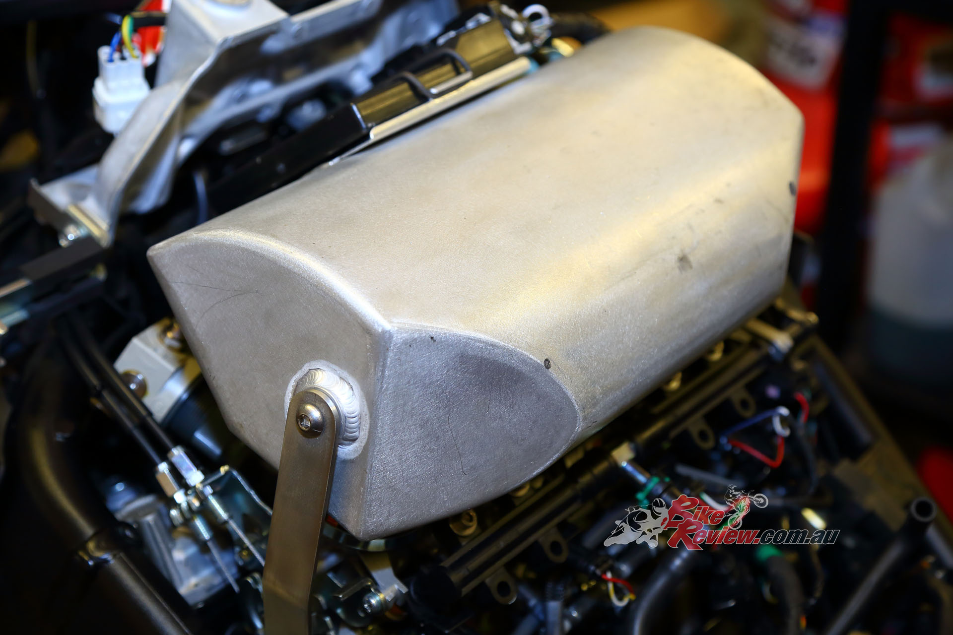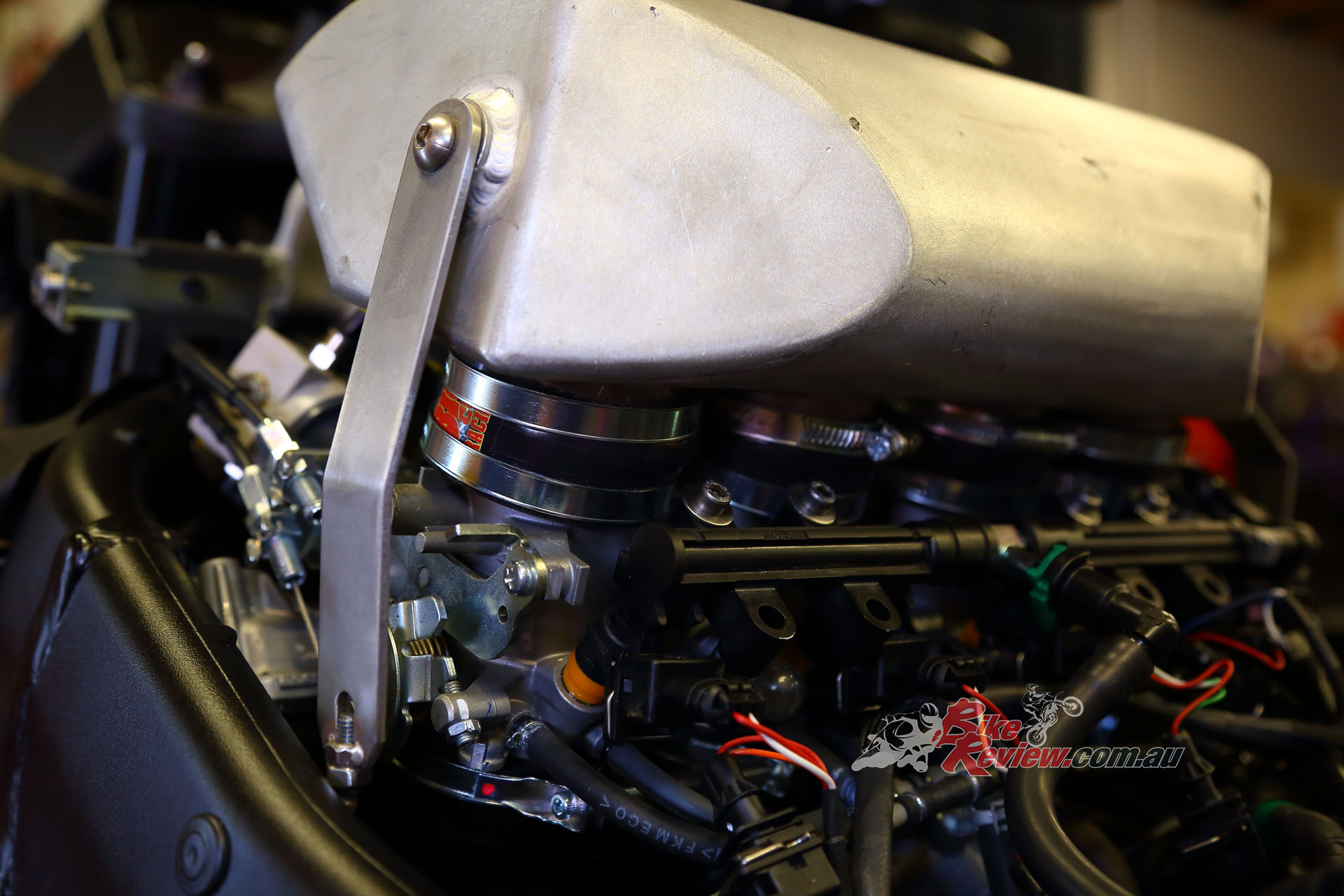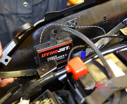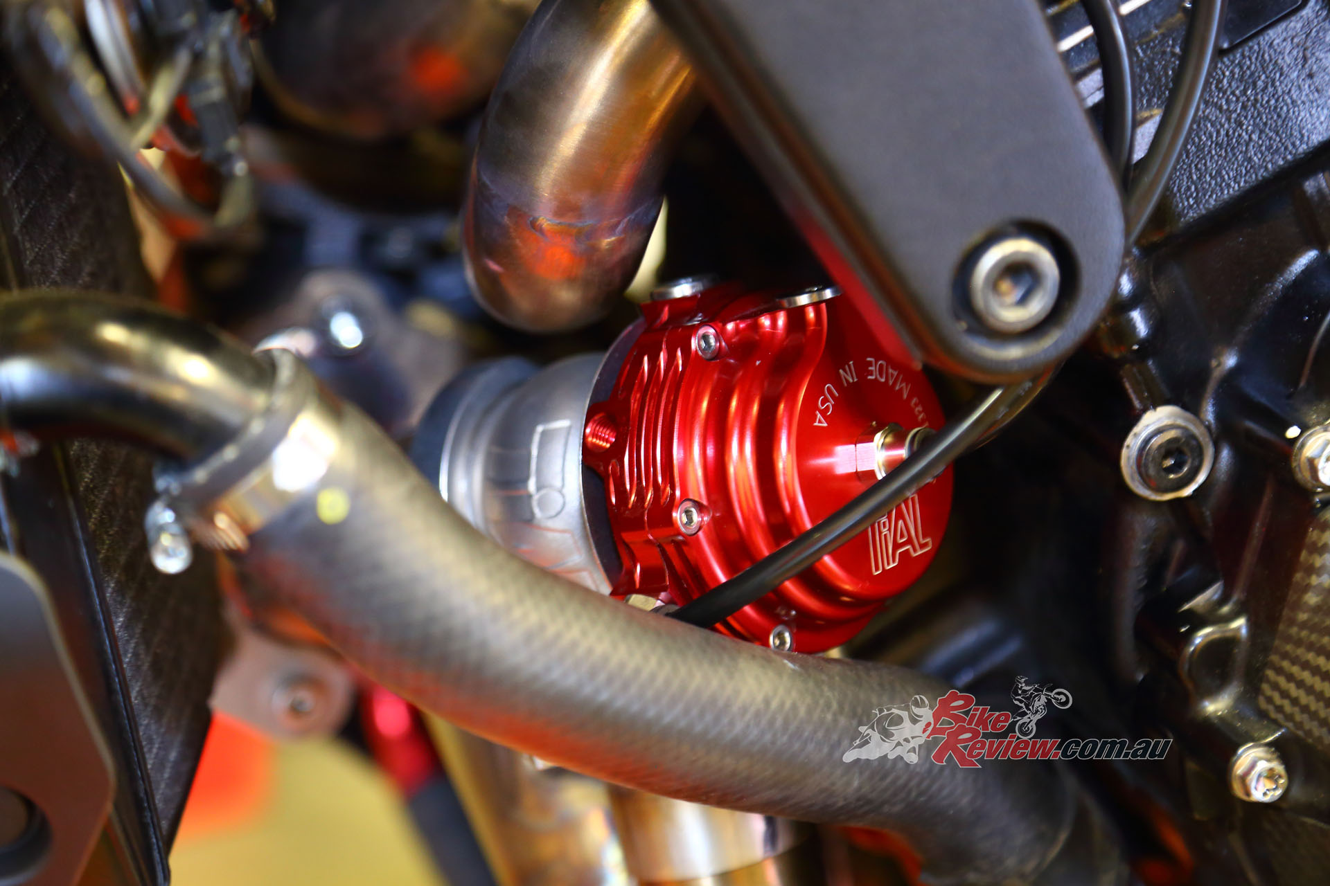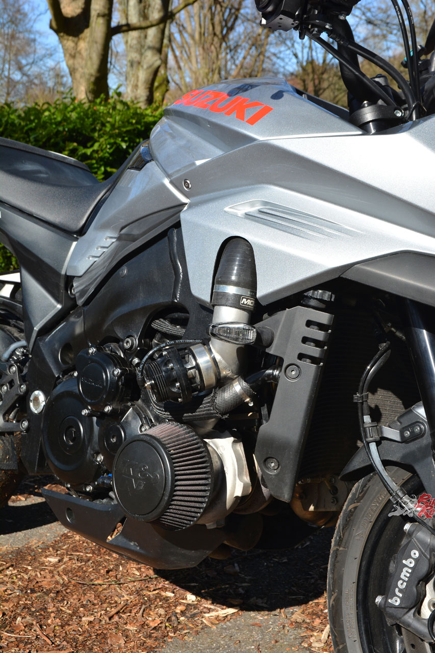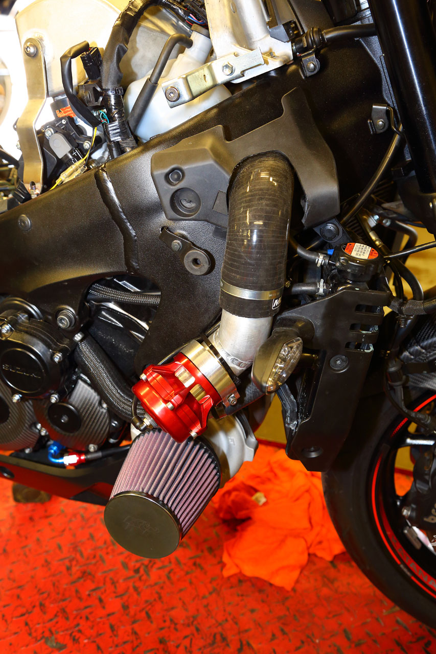 Alloy link pipe leads to the under-tank plenum chamber, Garrett ball-bearing turbo, Standard injectors and fuel pump, with a Dynojet Power Commander and external MAP sensor board.