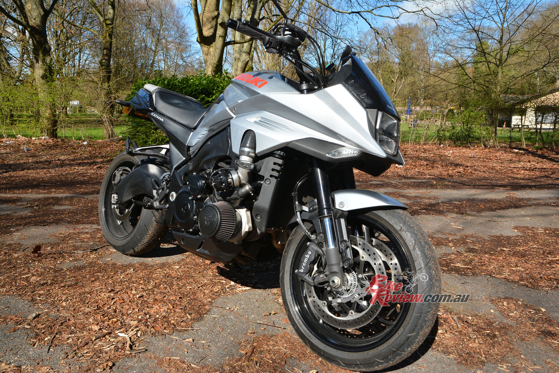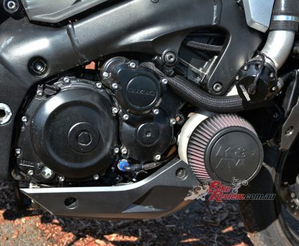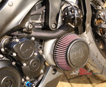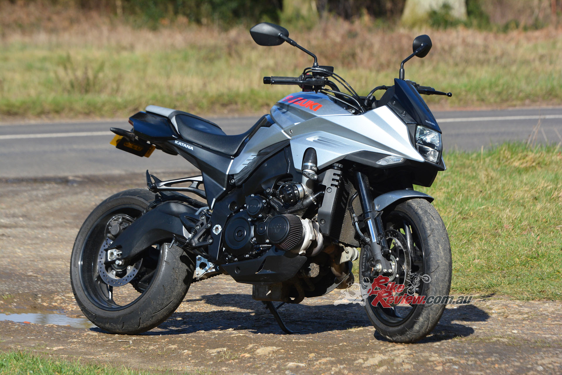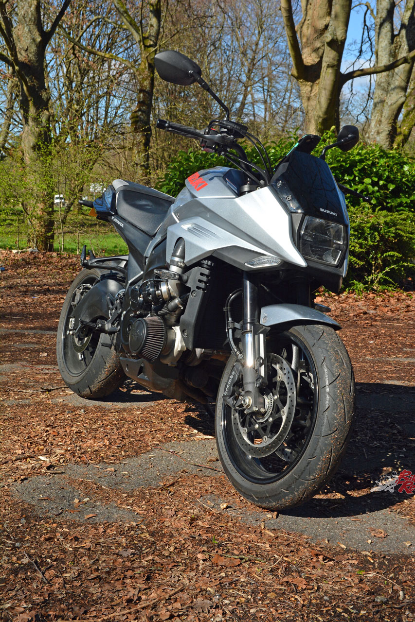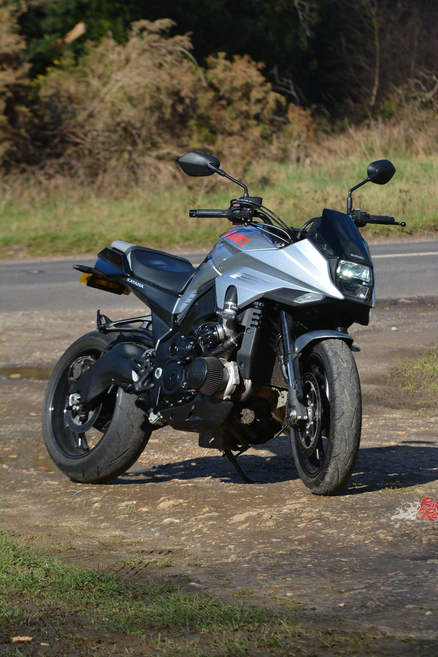 Adding a turbocharger and 100bhp+ to the new KATANA has not helped its marginal fuel range. Off-boost and trundling about, the consumption readout on the dash seems to be not too far off standard. But once you start spinning up the turbine, you can almost hear the tank being sucked dry. It’s one of those things – if you don’t mind stopping every 120km or so for a coffee and a chat with your mates then it won’t even be a factor for you to add fuel at the same time. The worst bit about the low fuel capacity is it’s not even something you could easily sort out – tyres, suspension, brakes, engine can all be swapped out or tuned up to your satisfaction.
