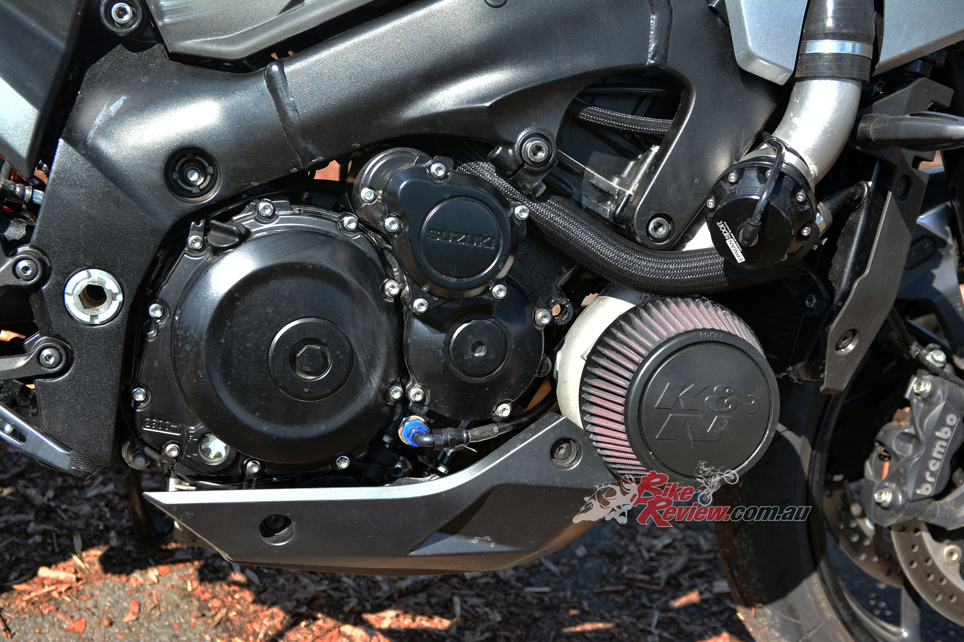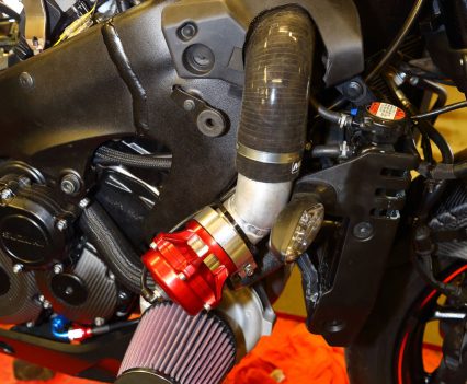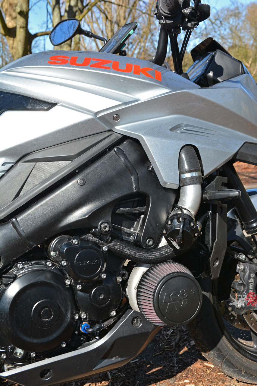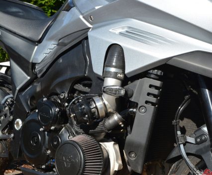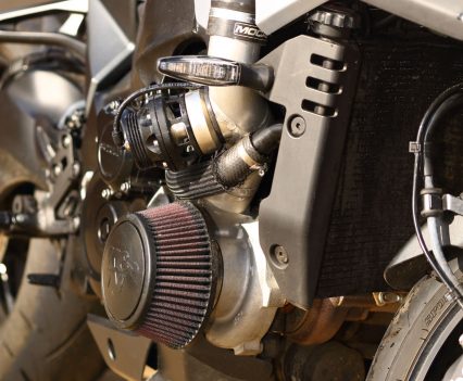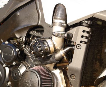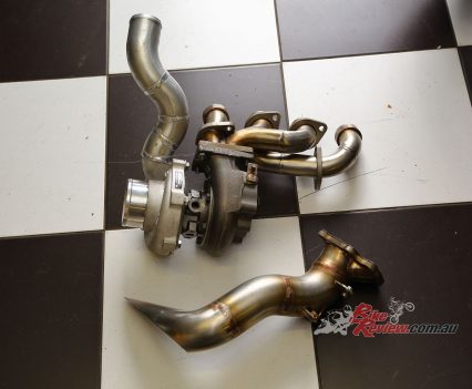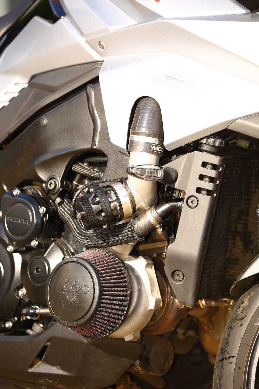 A Garrett ball-bearing turbo that’s been modified to suit the GSX-S1000 and KATANA install, with internal wastegate. Needs pipework to the engine for oil feed and return, and is attached to a gorgeous handmade stainless manifold/header pipe. The test bike had a simple screamer exit pipe, but Big CC can supply a link pipe and end can at extra cost.