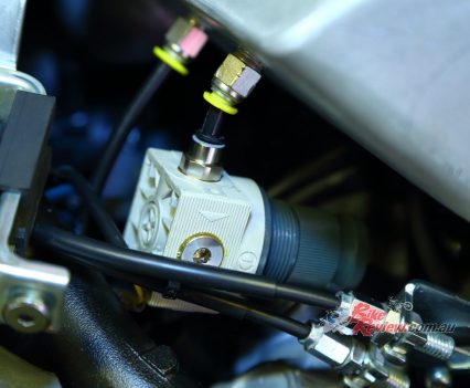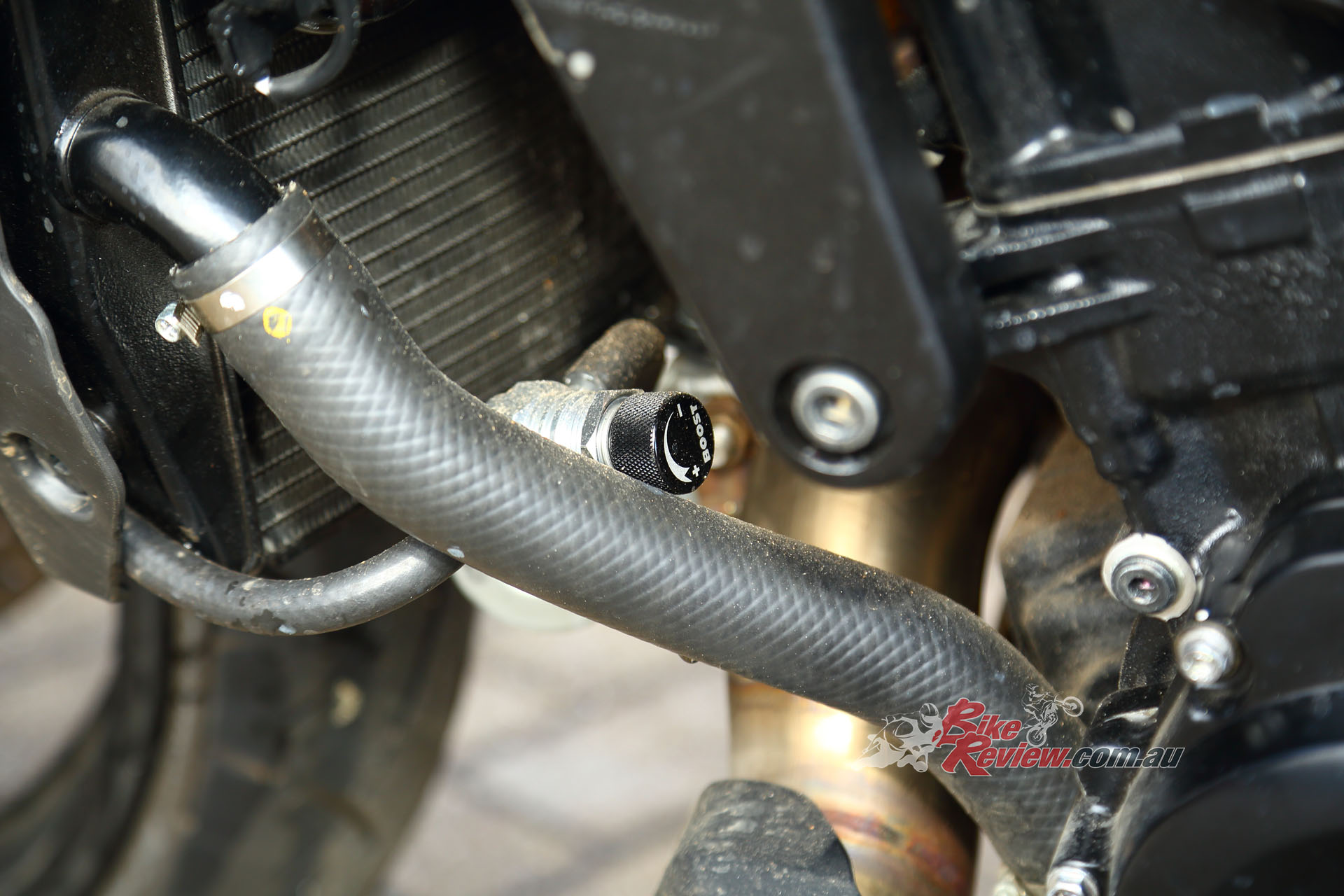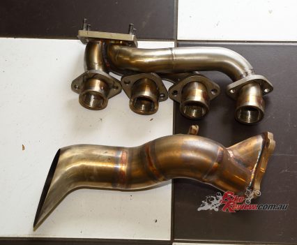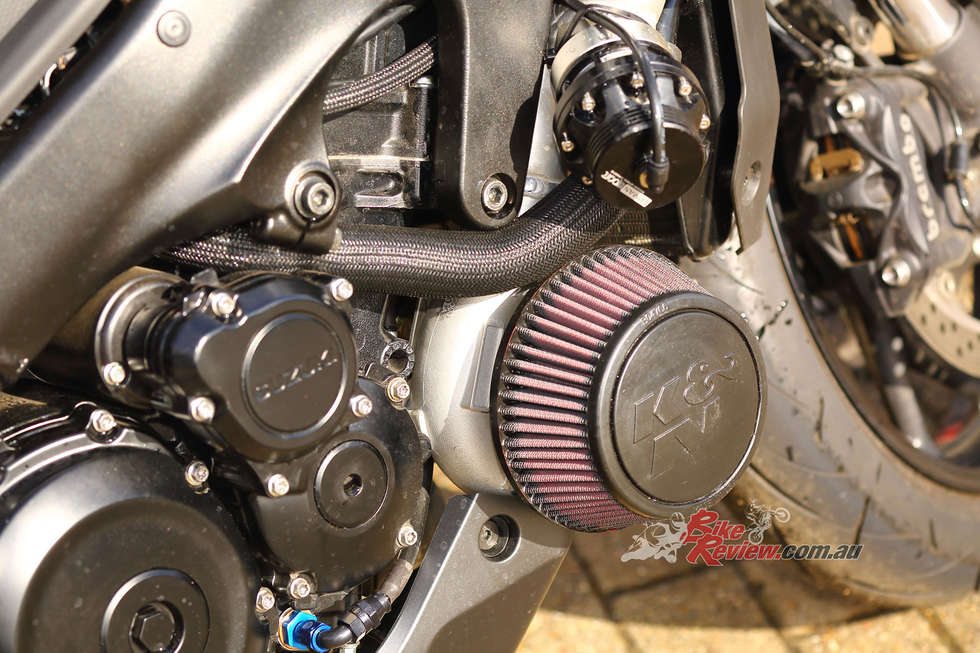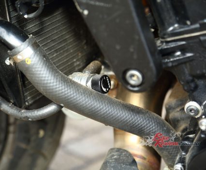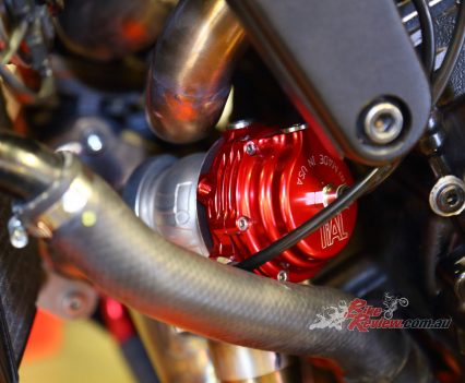 A Garrett ball-bearing turbo that’s been modified to suit the GSX-S1000 and KATANA install, with internal wastegate. Needs pipework to the engine for oil feed and return, and is attached to a gorgeous handmade stainless manifold/header pipe. The test bike had a simple screamer exit pipe, but Big CC can supply a link pipe and end can at extra cost.
