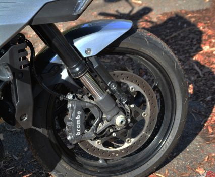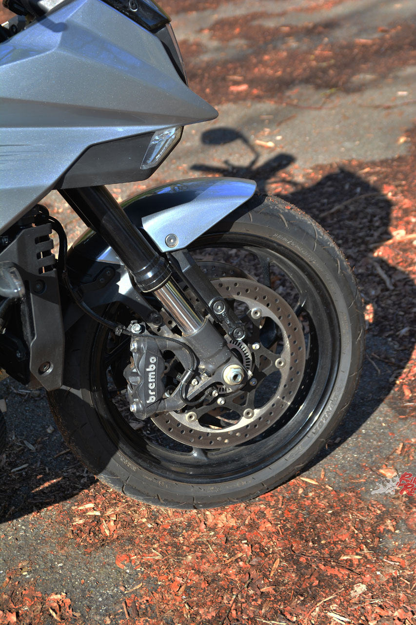 Brakes: Bosch ABS system, Brembo radial-mount four-piston calipers, 310mm rotors, 220mm rear rotor with Nissin caliper, Nissin conventional master-cylinder