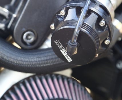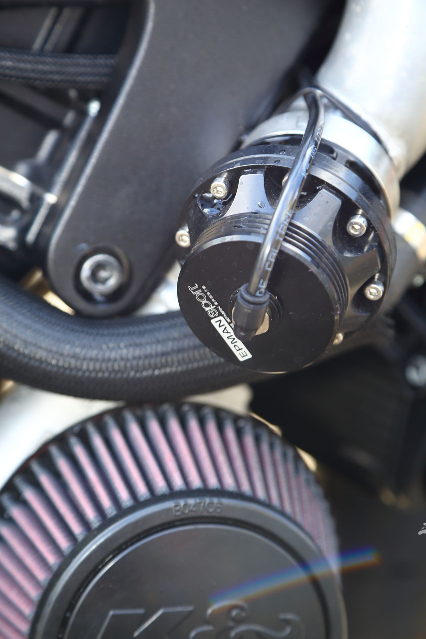 You can spend a lot of cash on fancy electronic boost controller solutions these days, but Sean has kept it simple here, with a manual boost dial. Simple turn the knob for more or less boost. Alloy link pipe leads to the under-tank plenum chamber. You can have either a simple fabricated plenum, or a fancy machined billet unit, depending on budget and later upgrade plans