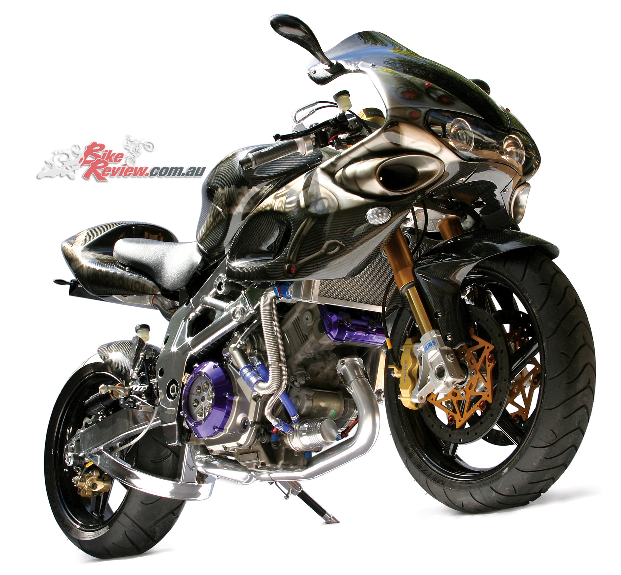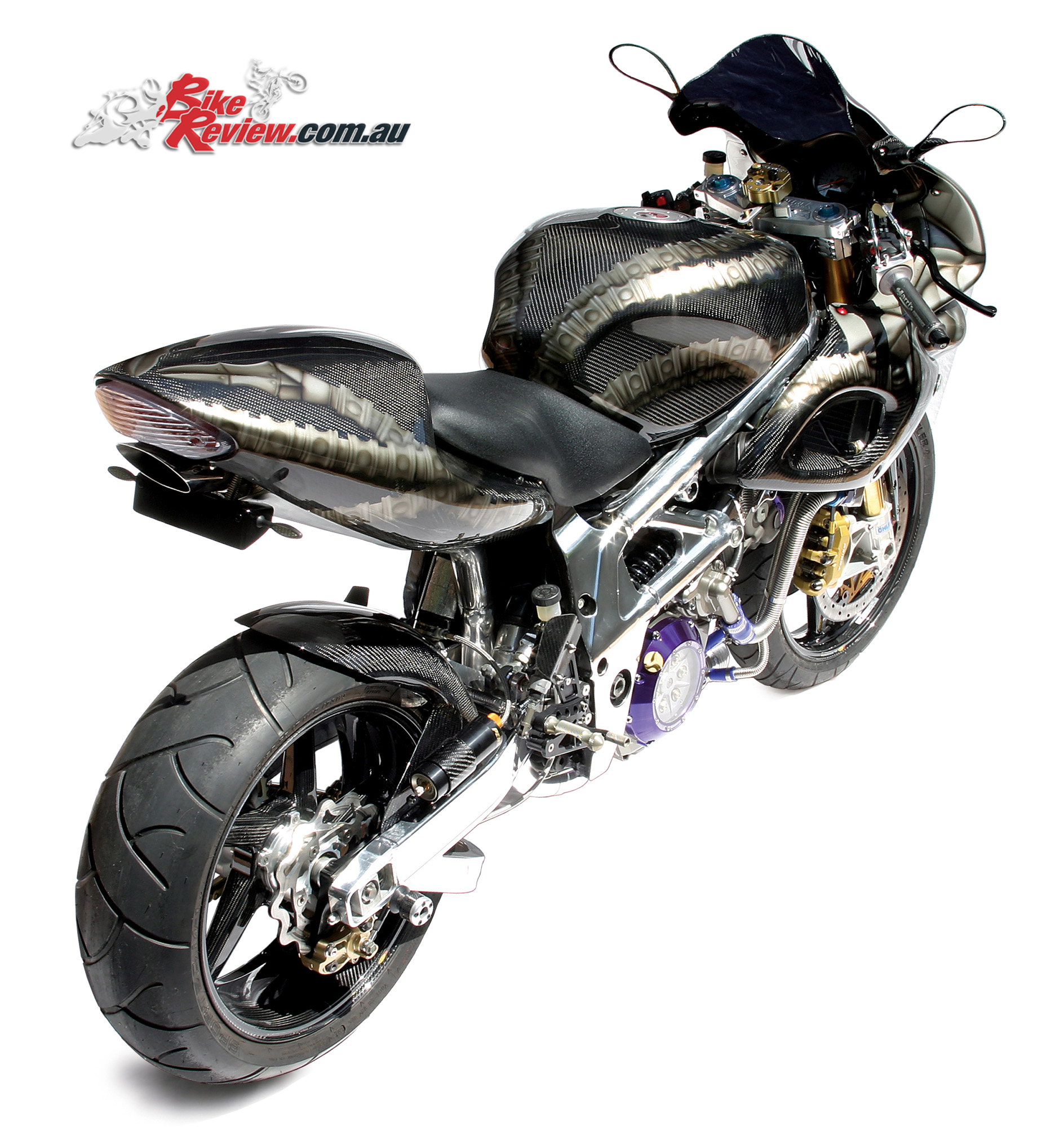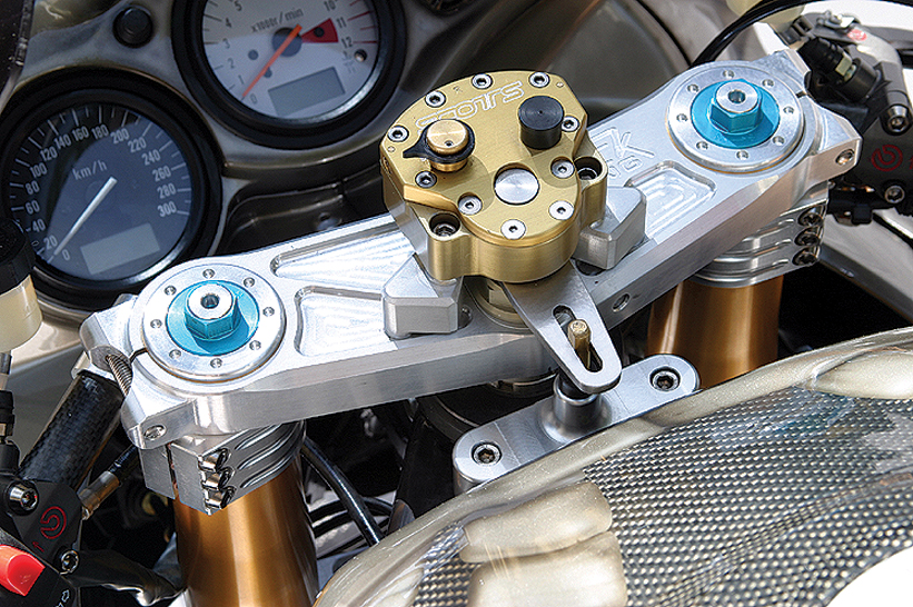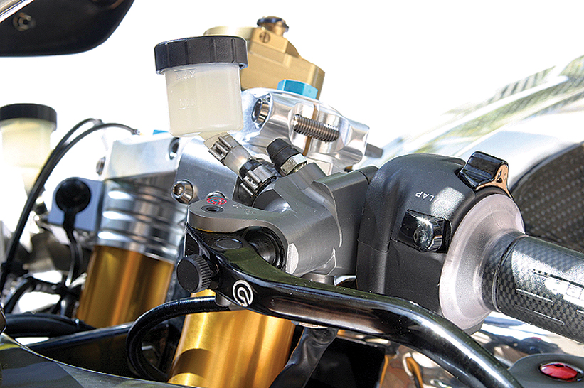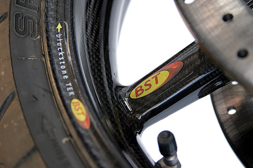The rolling stock is unbelievable. Try a pair of BST carbon-fibre wheels with 7075 billet centres, wrapped in a pair of sticky Metzeler hoops and the rear wearing a billet alloy Aluma-Lite sprocket. And those are only a sample of the carbon-fibre goodies.