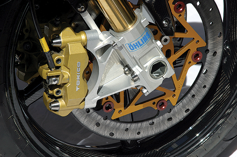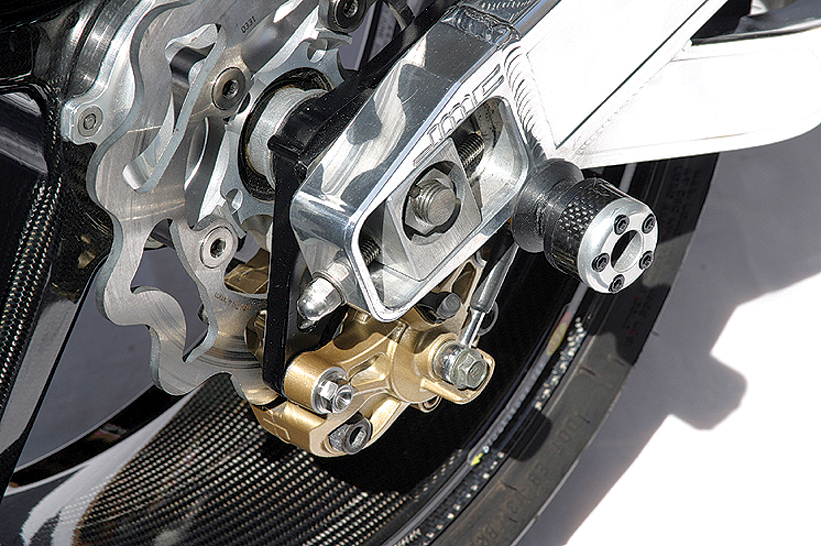 The back brake is just as impressive. “The rear Tokico squeezes a Galfer wave rotor via Goodridge lines, Ferodo pads and Motul fluid. The torque arm has been removed and the caliper fits on a channel in the swingarm.”