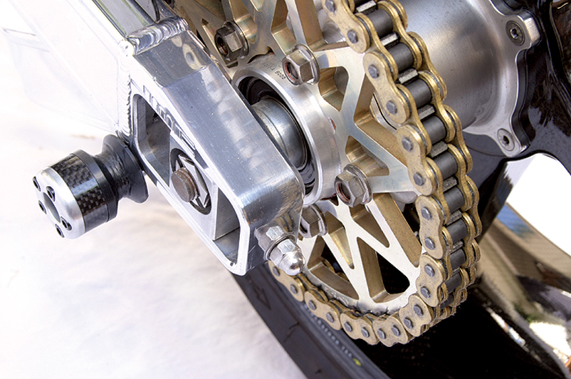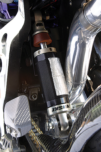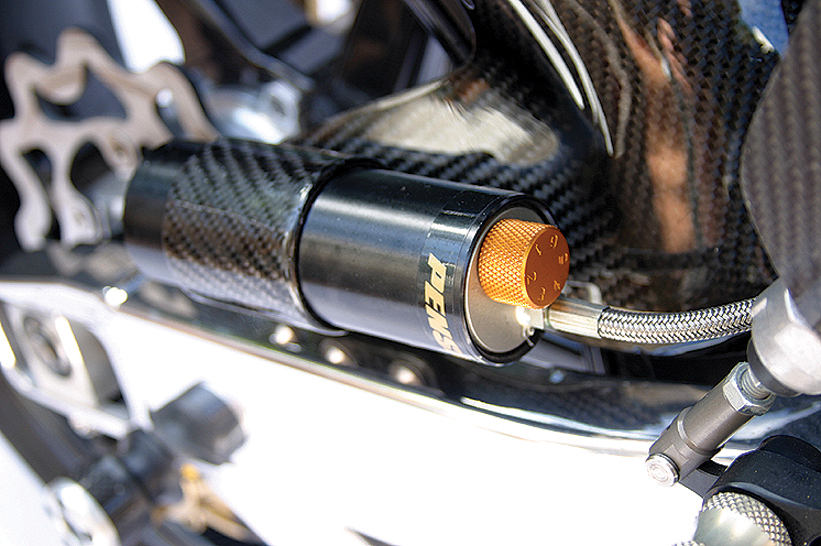 Out the back is a stock length JMC swingarm from the UK running Lindemann Engineering linkages and spacers and housing a fully adjustable Penski rear shock and Eibach 800lb spring. A Lindemann Engineering link converts the set-up to a more conventional and effective rod-style damper rather than the original radial system.