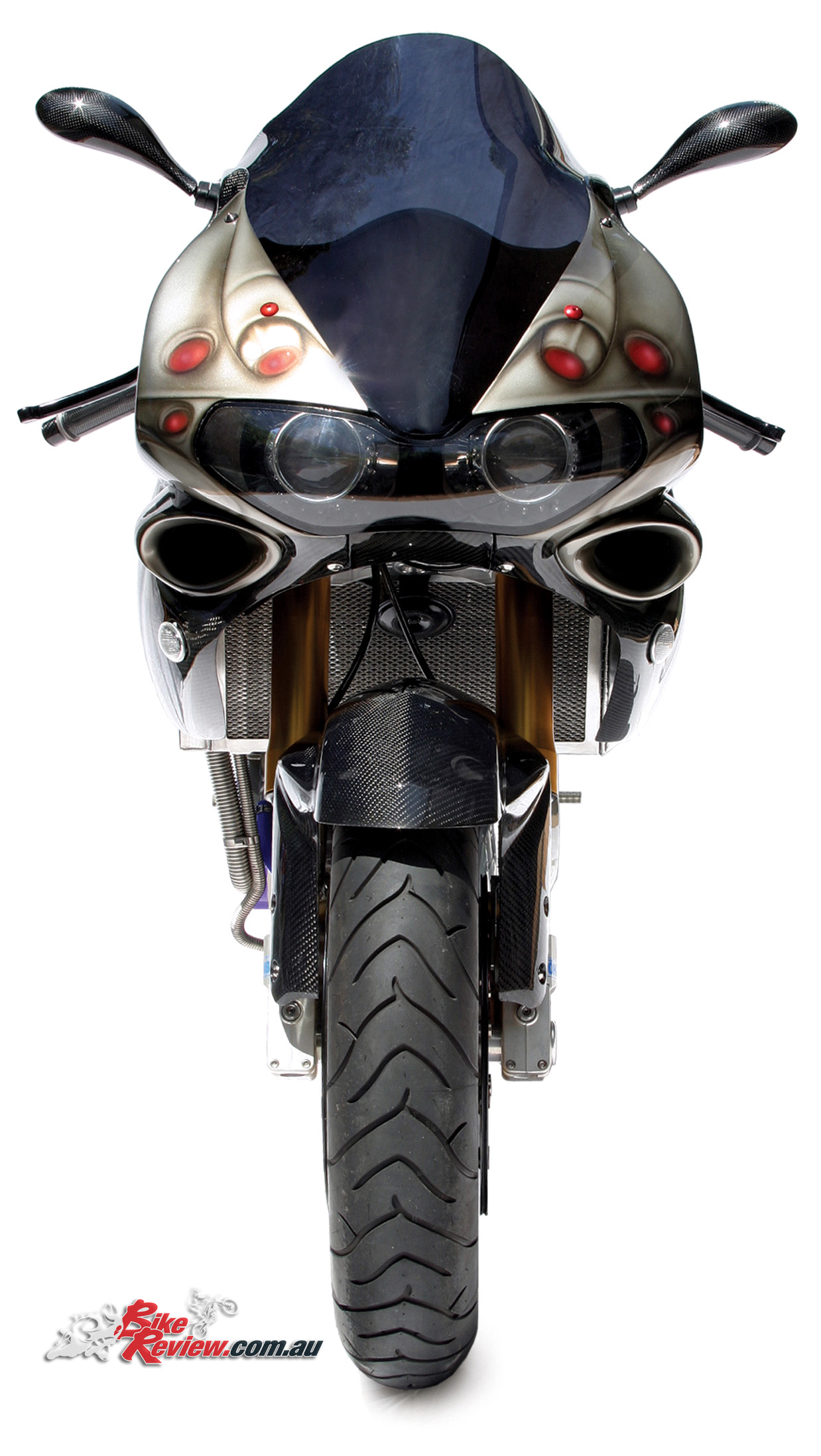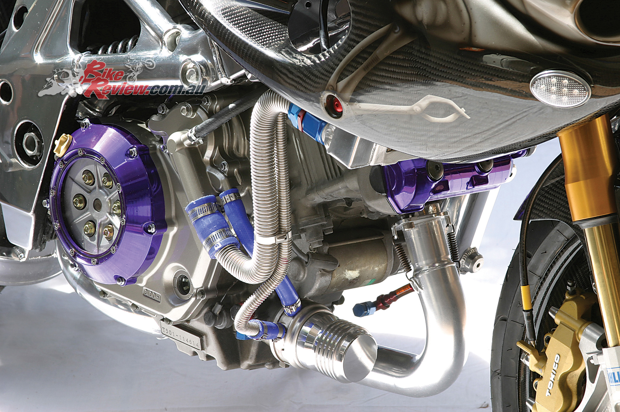 ENGINE: DOHC, eight-valve, liquid-cooled 90-degree V-twin four-stroke, bore and stroke of 98.0 x 66.0mm, 996cc, 11.2:1 compression, multi-stage EFI with 52mm throttle bodies, Power Commander II, digital ignition, K&N air filter and crankcase breather filters, carbon-fibre inlet tracts, Extreme Creations custom exhaust system, hydraulic clutch actuation conversion, Brembo clutch master cylinder, custom radiator, oil-to-water oil cooler, clear clutch cover