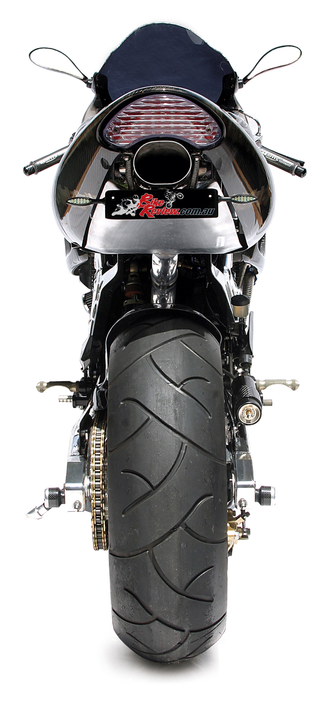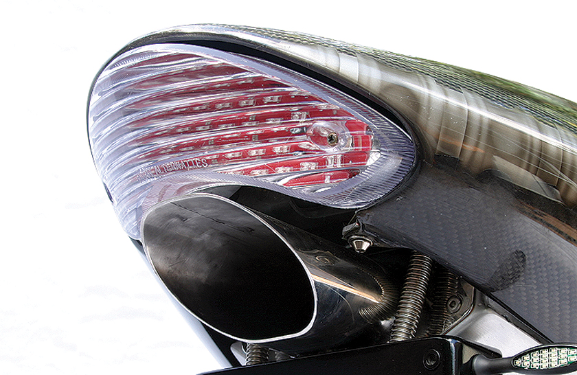 The exhaust system started as a Hindle two-into-one and was modified by Extreme Creations, eventually into the undertail set-up you see today. The muffler is a perfect fit under the tail and is a straight-through jobbie. The system has been ceramic coated by Competition Coatings and Rupes runs the bike on Mobil Synergy or, on payday, Elf BFK07.