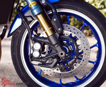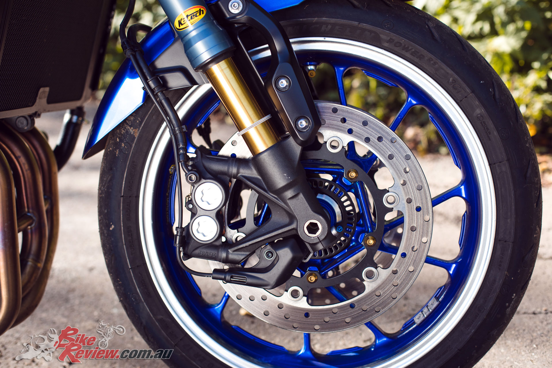 Two options are offered for uprating the suspension, from either K-Tech or Ohlins. The blue XSR900 shown came with a K-Tech kit, in which the internals of Yamaha’s upside down telescopic fork are replaced with new springs and a cartridge damper set-up featuring adjustability for preload, and damping, both compression and rebound. The rear suspension has a rising-rate linkage that’s unchanged but the single shock is replaced by a K-Tech item.