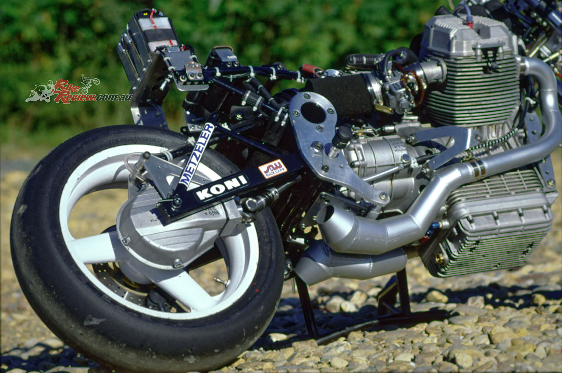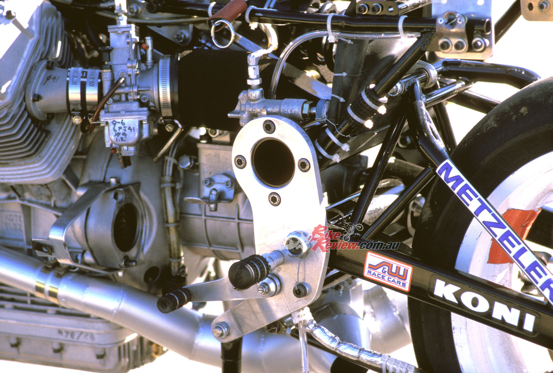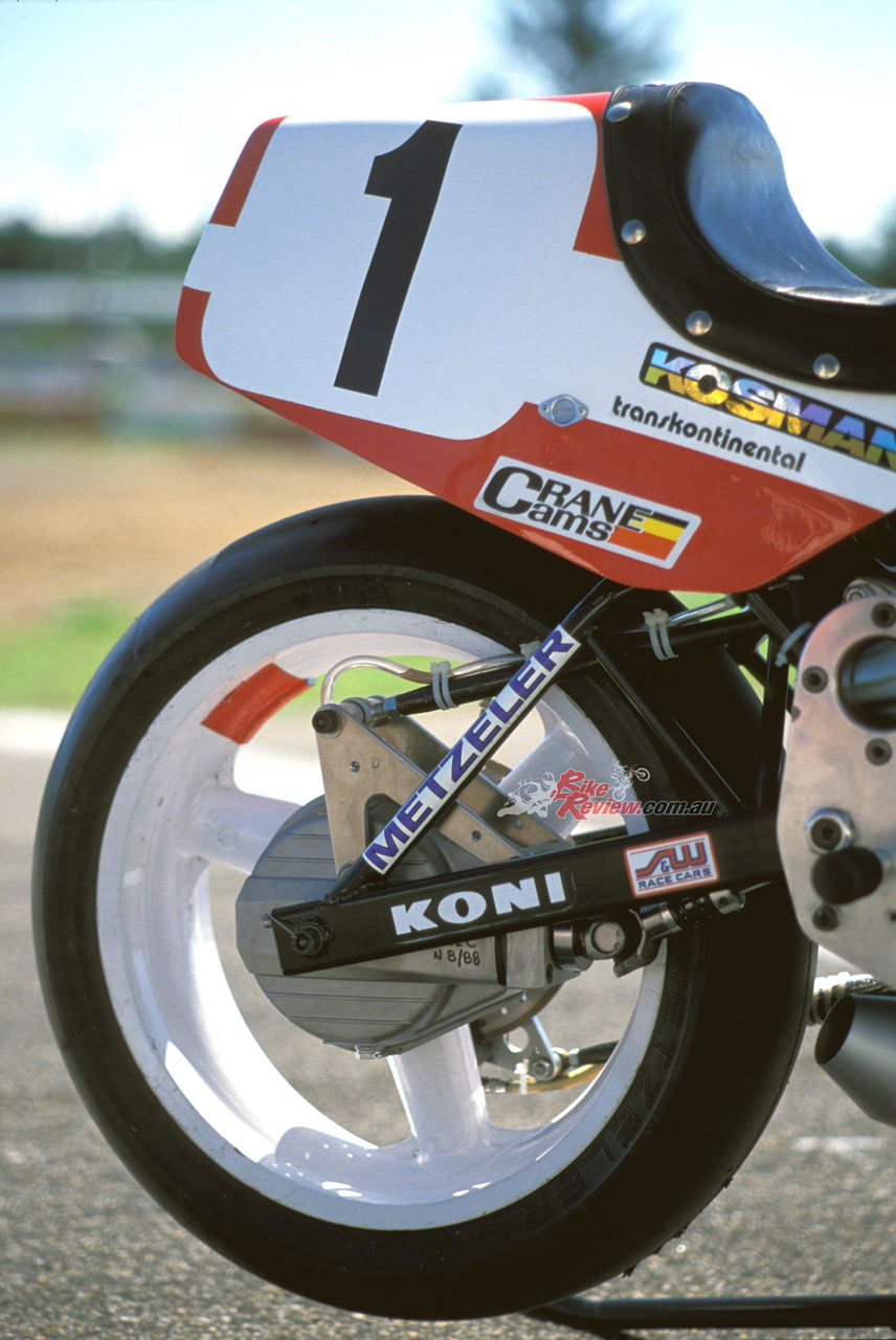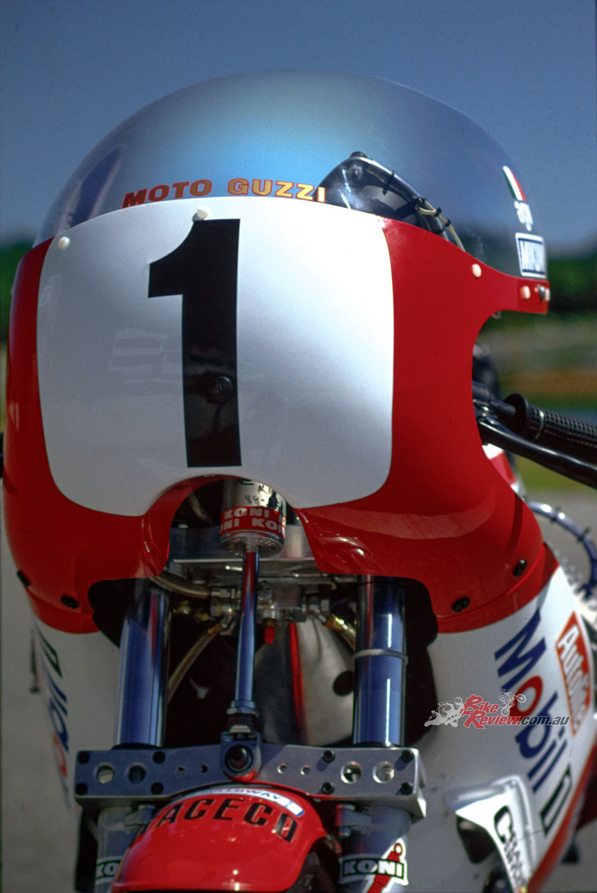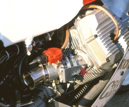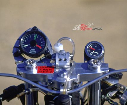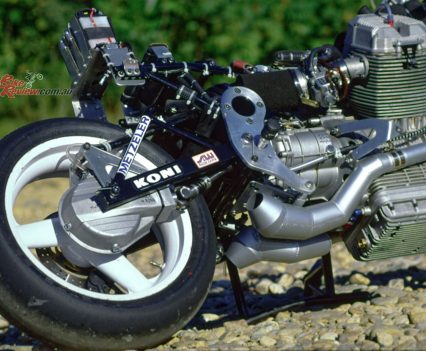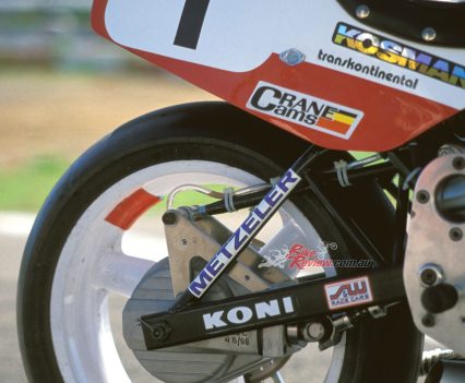 This carried twin half-inch/12.7mm thick aluminium plates bolted to it either side, which located the gearbox as well as acting as the pivot for the box-section cantilever monoshock swingarm with fully-adjustable Koni F1 shock pivoting on the frame backbone. The engine was offset a half-inch/12.7mm to the right to allow use of a 5.50in wide cast aluminium 17-¬inch rear wheel specially made for Guzzi by Marvic, shod like its 3.50in wide front partner of the same diameter with Metzeler radial slicks.