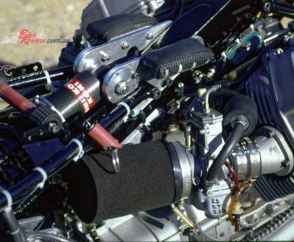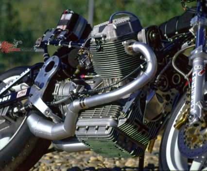However, in pursuit of the higher revs at which he believed the four-valve heads would come into their own, Wittner short-stroked the engine after Daytona to 95.25 x 70mm for a full 999cc – the same dimensions as his 1987 two-valve Le Mans-derived BoTT title-winner. To achieve this, he fitted a crank from a 750cc V7 Sport, rebalanced for use with the same Carrillo rods and Ross high-silicone three-ring pistons he’d used on the ’87 bike, running in bored-out cylinders fitted with Gilnisil chrome bores, with compression raised to 11.25:1, and larger 41.5mm Mikuni flatslides fitted.