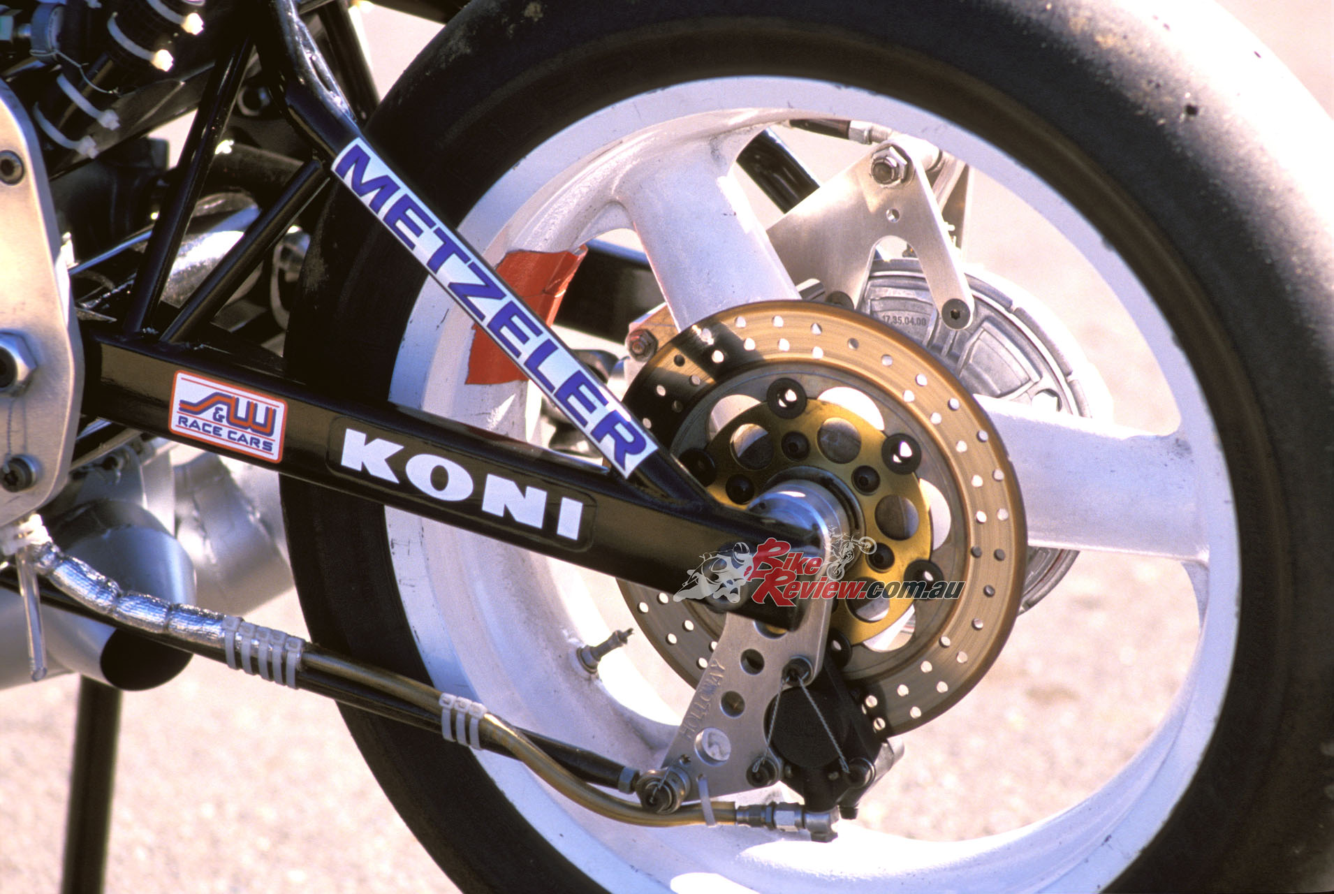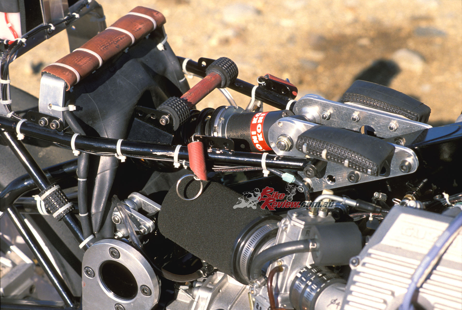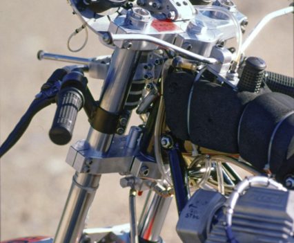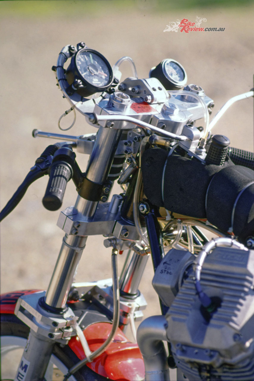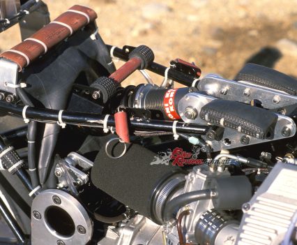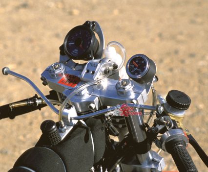 Up front the 41.3mm Marzocchi M1R forks which Wittner had previously employed, set at a 25º head angle via Kosman triple-clamps with 102mm of trail, had now been gutted, leaving only the springs inside the fork tubes, and the sliders merely providing a convenient means of locating the front wheel. The damping had now been transferred to another Koni F1 shock mounted externally in front of the headstock, where it was quickly and easily adjustable for fine tuning, as well as offering the superior response of a fully-adjustable gas-charged unit with sophisticated damping, and increasing the lateral stability of the fork as a whole, according to Wittner.