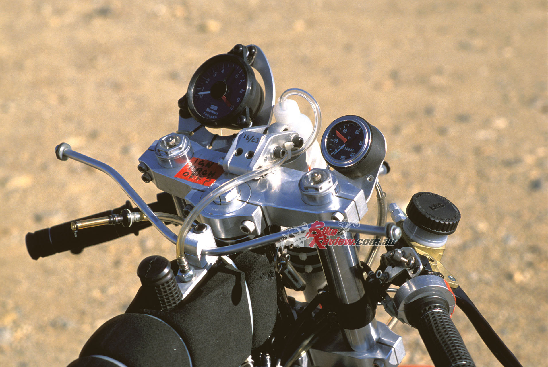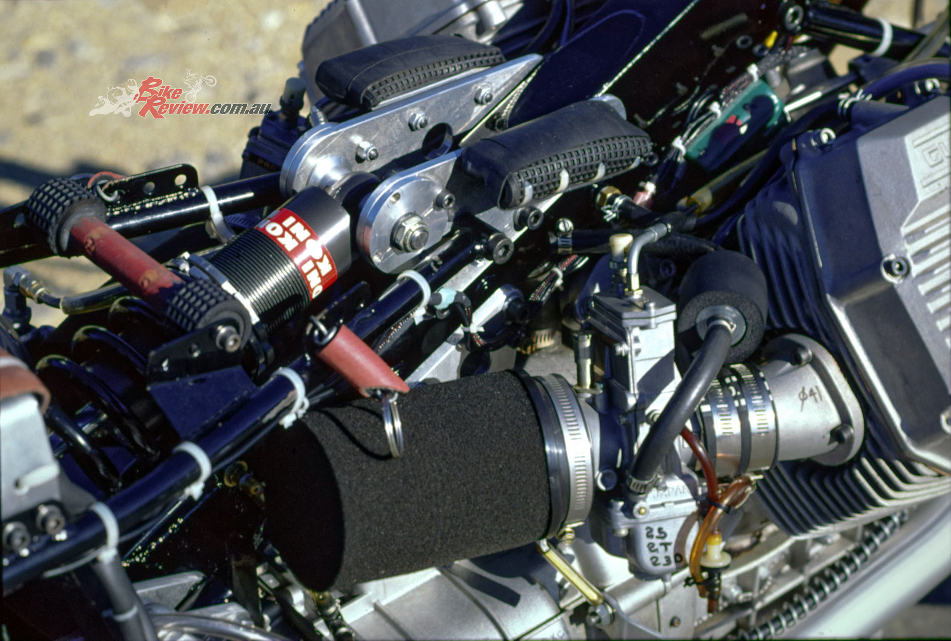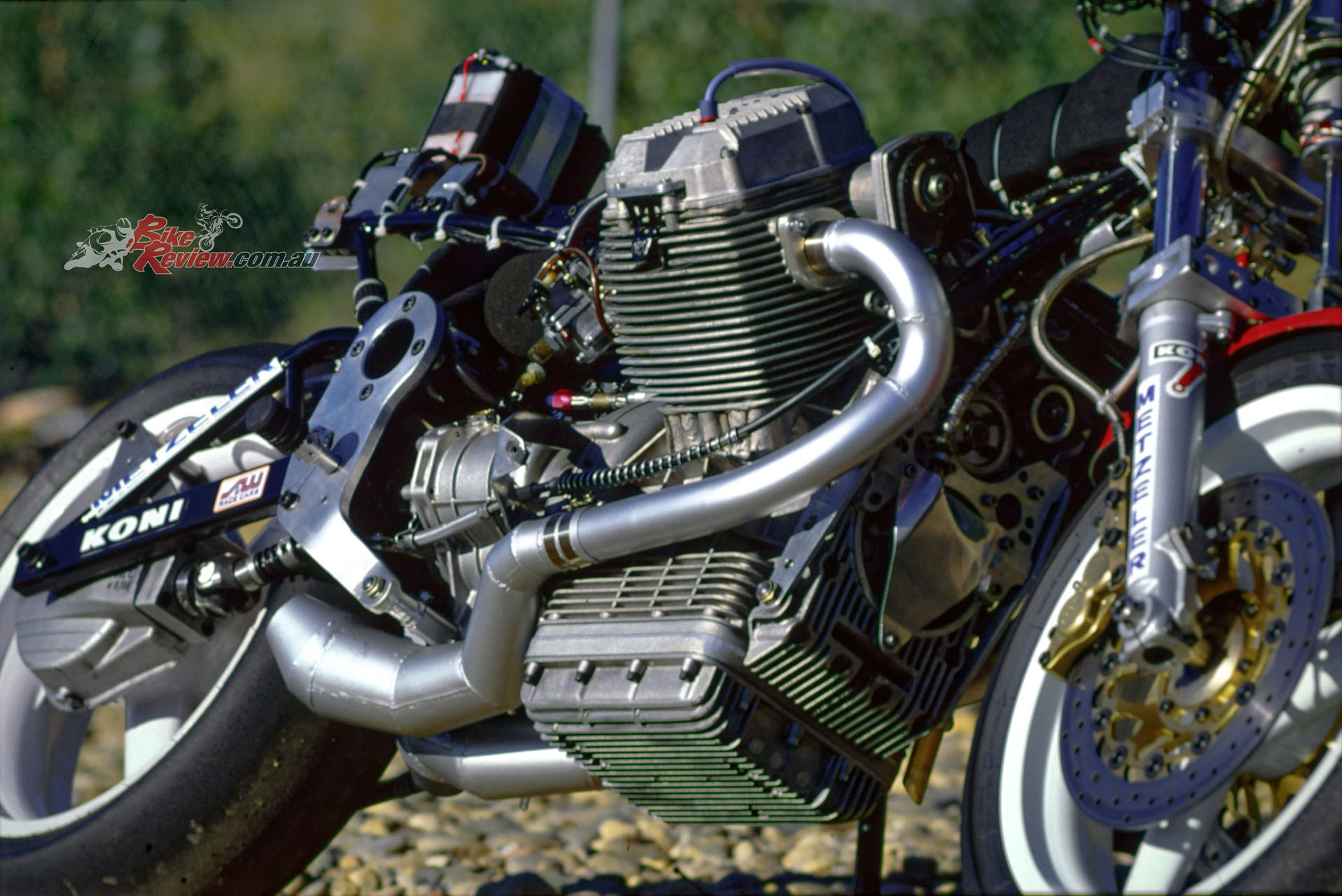 Up front the 41.3mm Marzocchi M1R forks which Wittner had previously employed, set at a 25º head angle via Kosman triple-clamps with 102mm of trail, had now been gutted, leaving only the springs inside the fork tubes, and the sliders merely providing a convenient means of locating the front wheel. The damping had now been transferred to another Koni F1 shock mounted externally in front of the headstock, where it was quickly and easily adjustable for fine tuning, as well as offering the superior response of a fully-adjustable gas-charged unit with sophisticated damping, and increasing the lateral stability of the fork as a whole, according to Wittner.