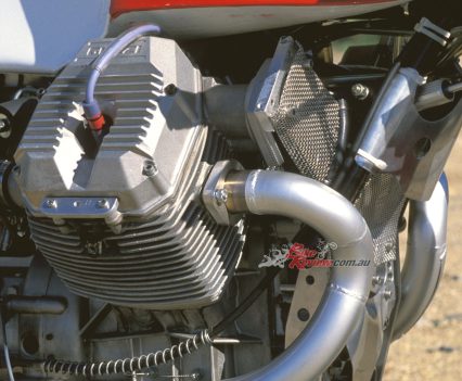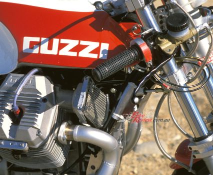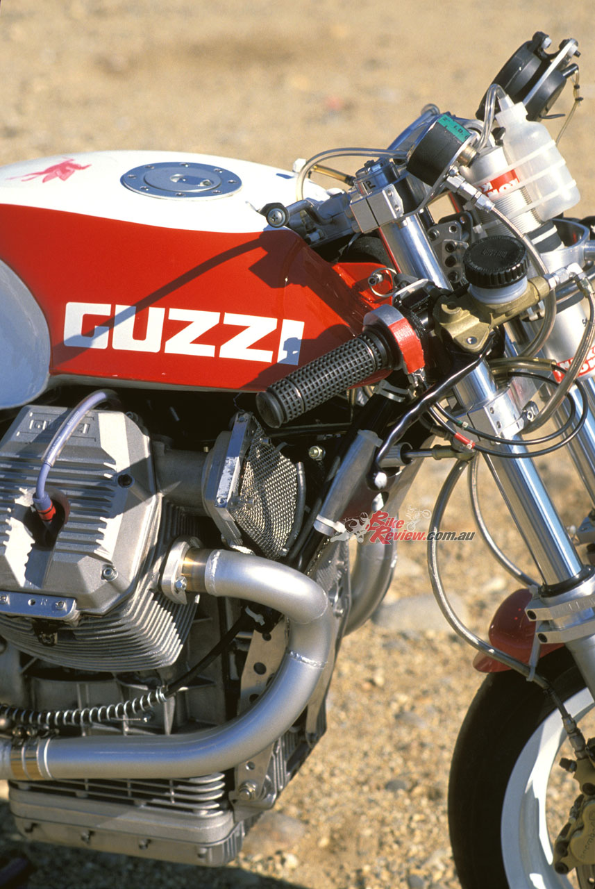 Still, I found the way the 8V Guzzi put the power down at Loudon quite impressive, especially considering the rough road surface for a race track of this calibre, hosting an AMA Superbike round each year. The cantilever rear end soaked up all but the most obscene bumps, even potholes, and had been set up with just the desirable amount of anti-squat to make the most of the radial tyre. The compliant, fully-adjustable Koni unit had been well dialled in and delivered responsive feedback without bottoming out in the dip at the bottom of Loudon’s steep descent.