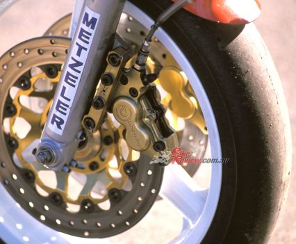 Chassis: Chrome-moly fabricated square-section backbone frame Suspension: Front: Telescopic forks with single centrally-mounted fully-adjustable Koni F1 shock Rear: Box-section steel cantilever monoshock with fully-adjustable Koni F1 shock rake 25 degrees trail 102mm, wheelbase 1460mm, Brakes: Front: 2 x 300mm Brembo floating cast iron discs with four-piston Brembo calipers, interconnected to rear brake at handlebar lever Rear: 1 x 230 mm Brembo floating cast iron disc with two-piston Brembo caliper, operated by handlebar lever on 90/10% linked ratio Tyres/ Wheels: Front: 120/70-17 Metzeler slick on 3.5 inch Marvic cast magnesium wheel Rear: 170/55-17 Metzeler slick on 5.5 inch Marvic cast magnesium wheel