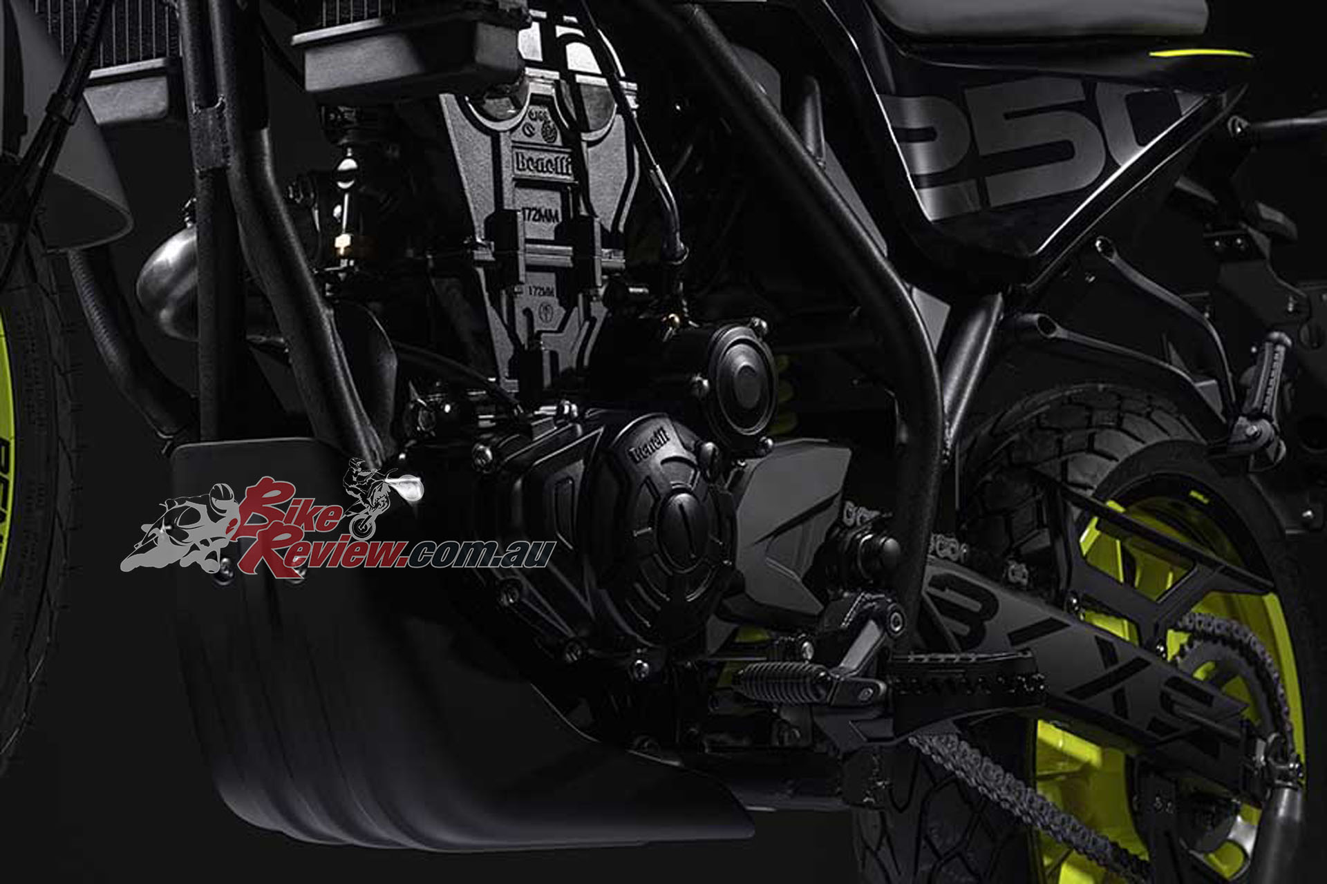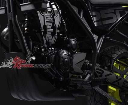 The single-cylinder 249cc, four-stroke engine is liquid cooled, with double overhead cams and electronic fuel injection, shared with the rest of the 250cc range. Its maximum power is 25.8hp@9250 rpm and 21Nm@8000rpm.