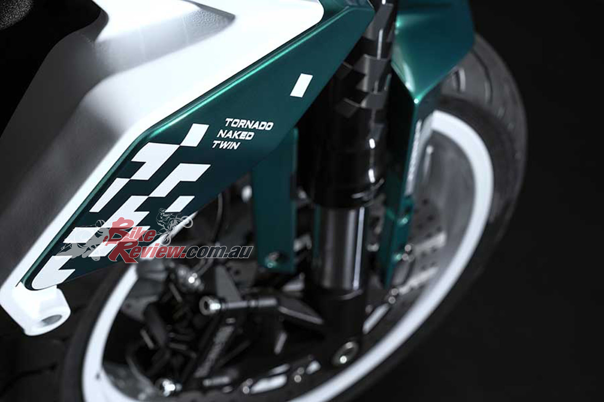 The chassis of the Tornado Naked Twin 500 is supported by a tubular steel trellis frame. It’s a compact and agile bike thanks to a wheelbase of only 1451mm. The suspension setups consists of an upside-down fork with 50mm legs and 125mm travel, at the rear there is a central monoshock featuring adjustable spring preload and rebound damping, with a travel of 41.2mm.