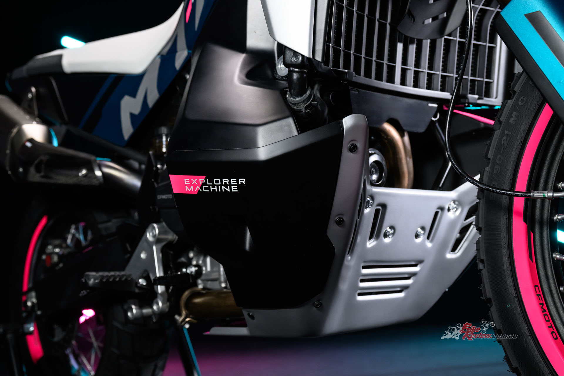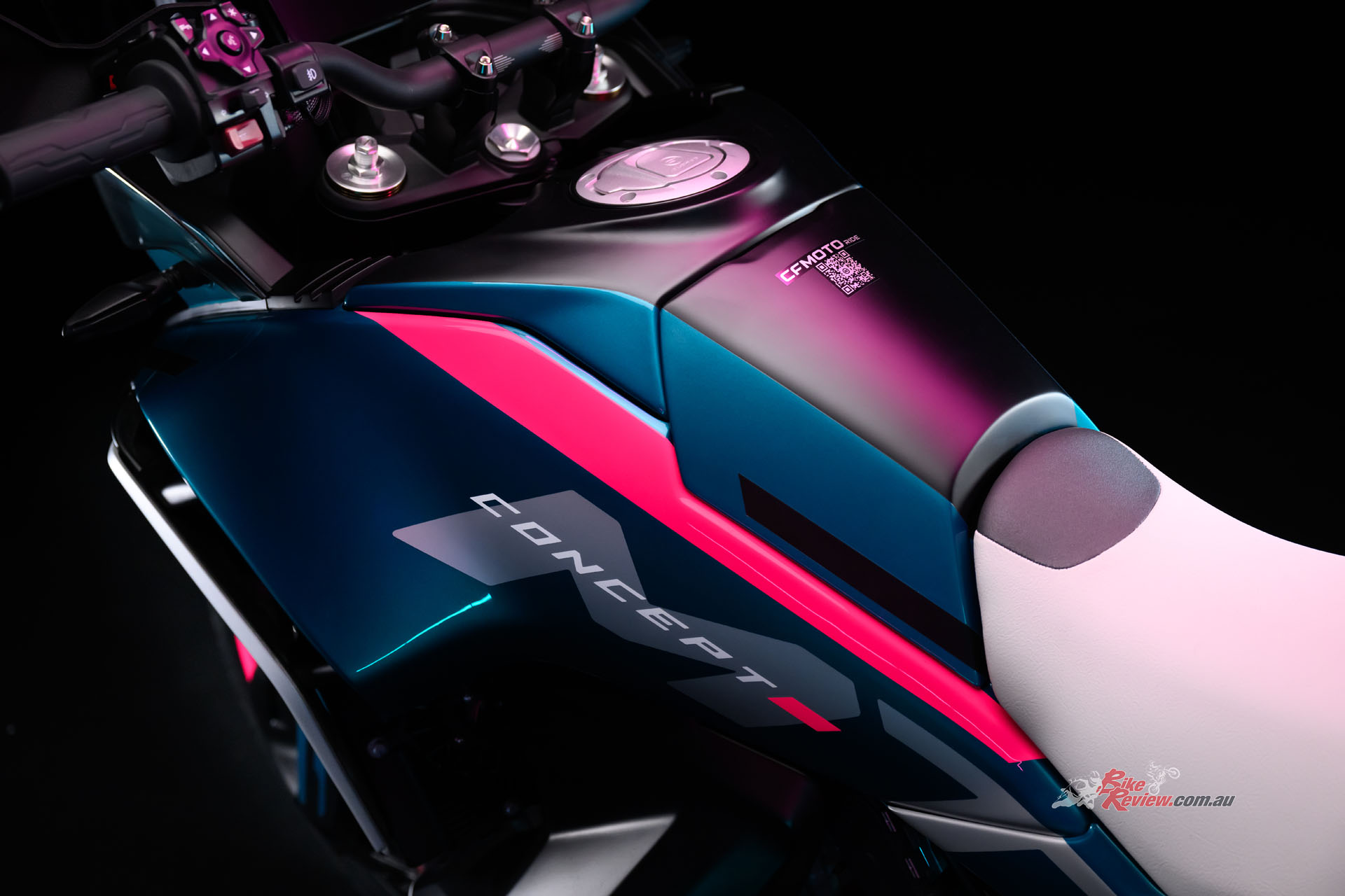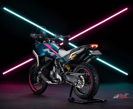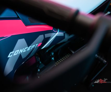 The MT-X CONCEPT has aunique blend of graphics and colours. CFMOTO say that “the ‘octanium’ colour symbolises mature attitudes toward new challenges, while the Fluro accents pay homage to CFMOTO’s Moto3 racing efforts.”