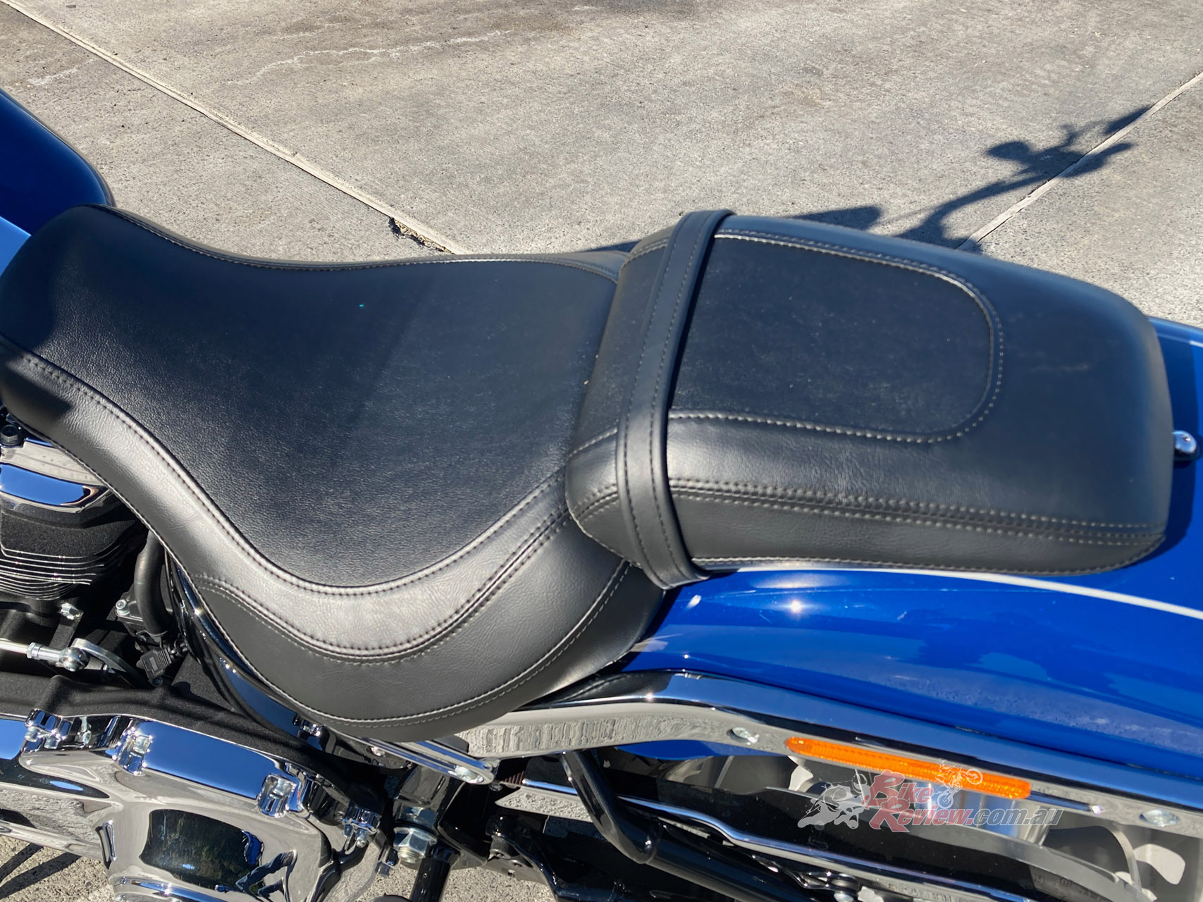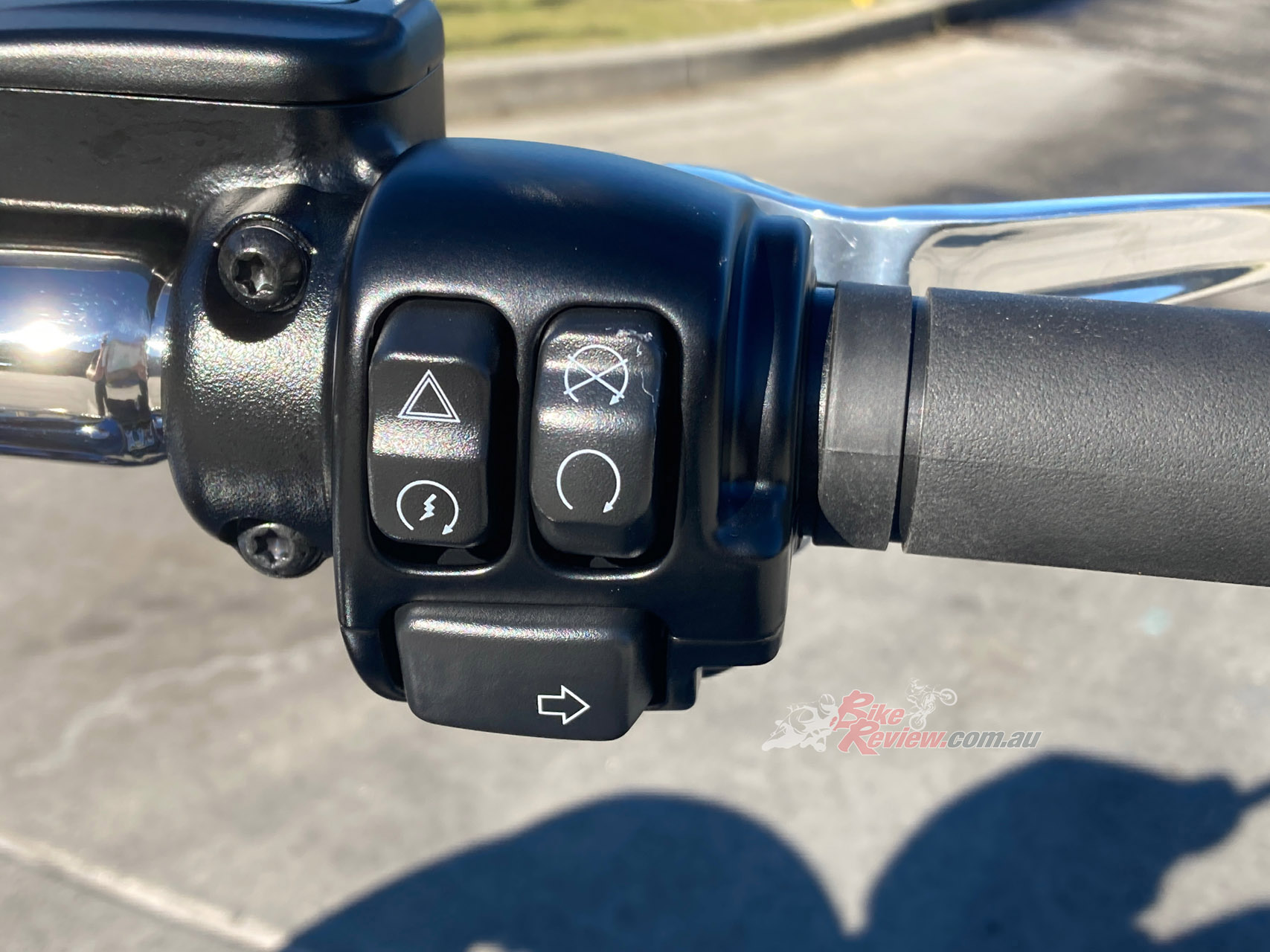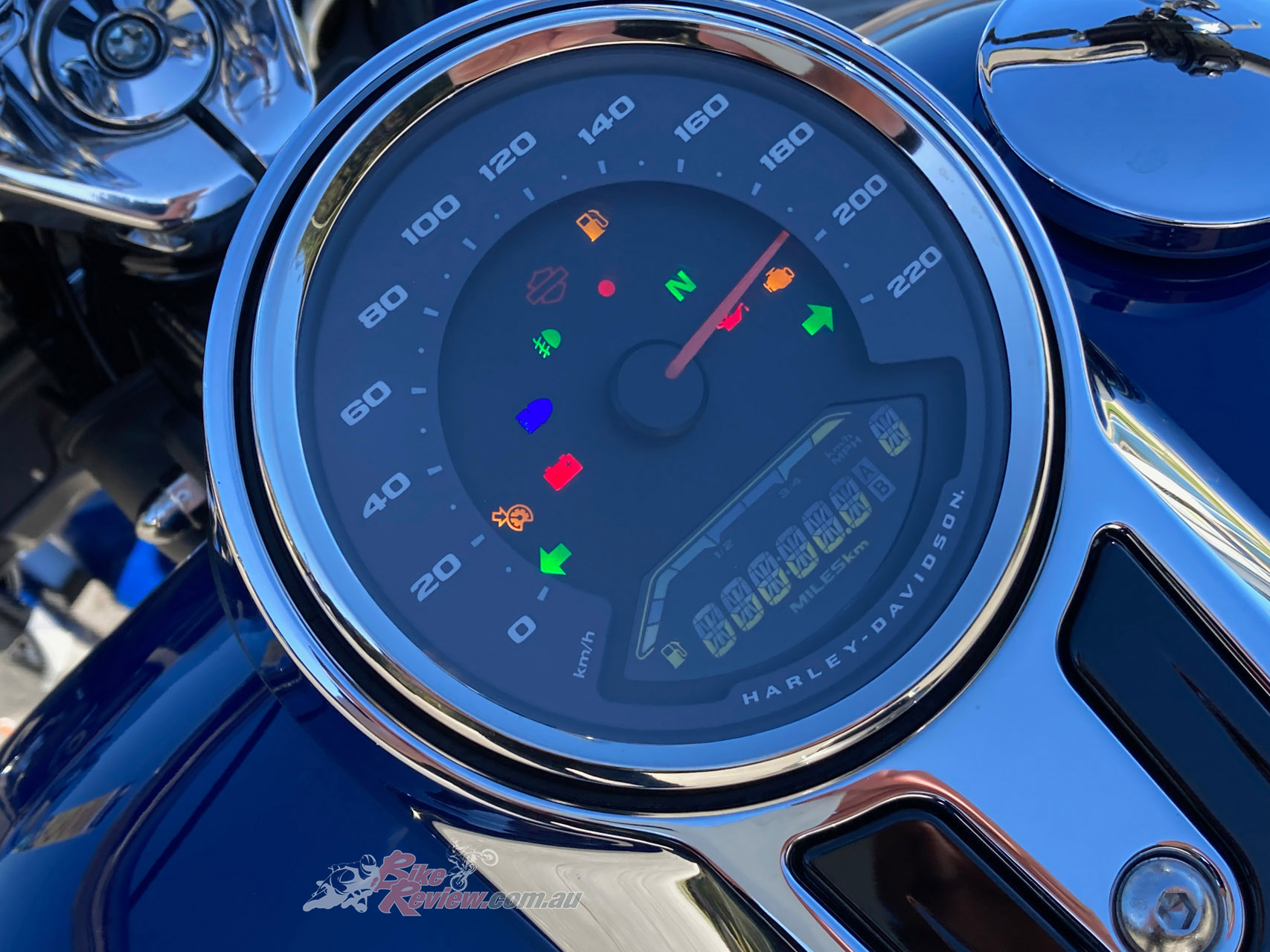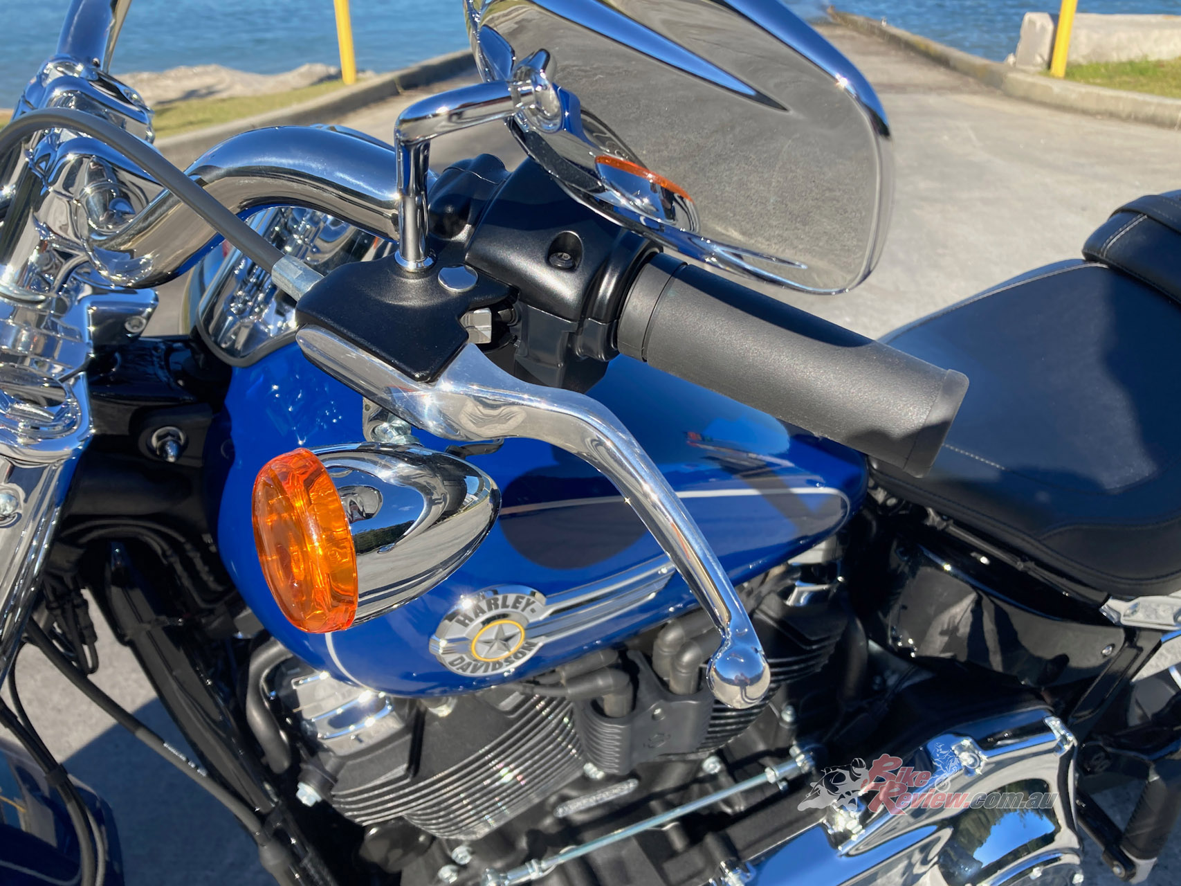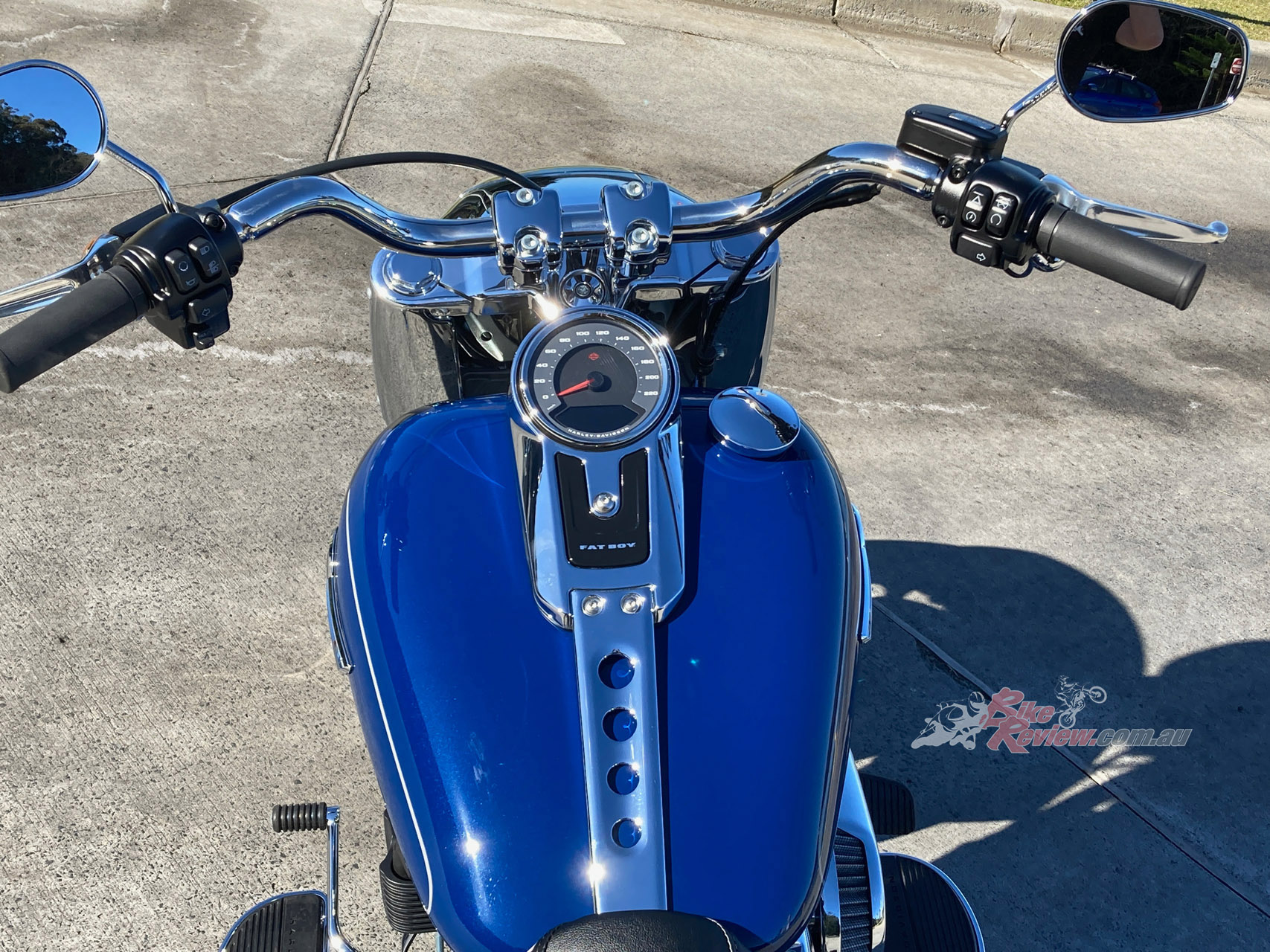 The riding position is comfortable. I’m 187cm and fit the Fat Boy well. Enough legroom (although I’d like bigger platforms so I could change feet position occasionally), a comfy and generous enough seat (good for 1.5hrs for me), and the reach to the wide ‘bars is good. Of course, I’m a windsock up in the breeze, but that’s all part of the ride on a cruiser or nakedbike. The switchgear is all easy to use and standard H-D stuff, the tank mounted dash need a look down but the big speedo needle helps.