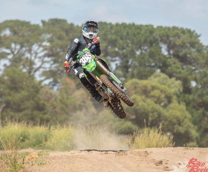 The On Point tuned suspension made Campbell’s bike handle amazingly and tackle the loamy conditions of the Mornington Peninsula Motorcycle Club with ease. The Akrapovic exhaust system gives the already powerful 2023 KX250 even more bottom-end power making it easier to hold a higher gear on those tight turns.