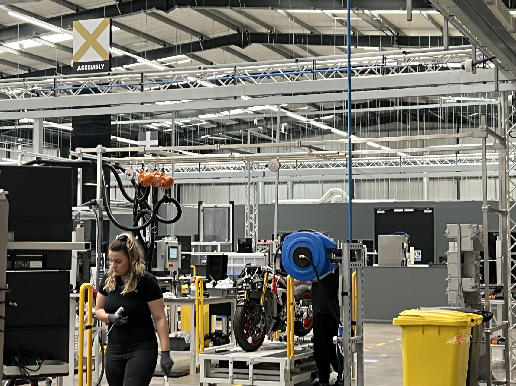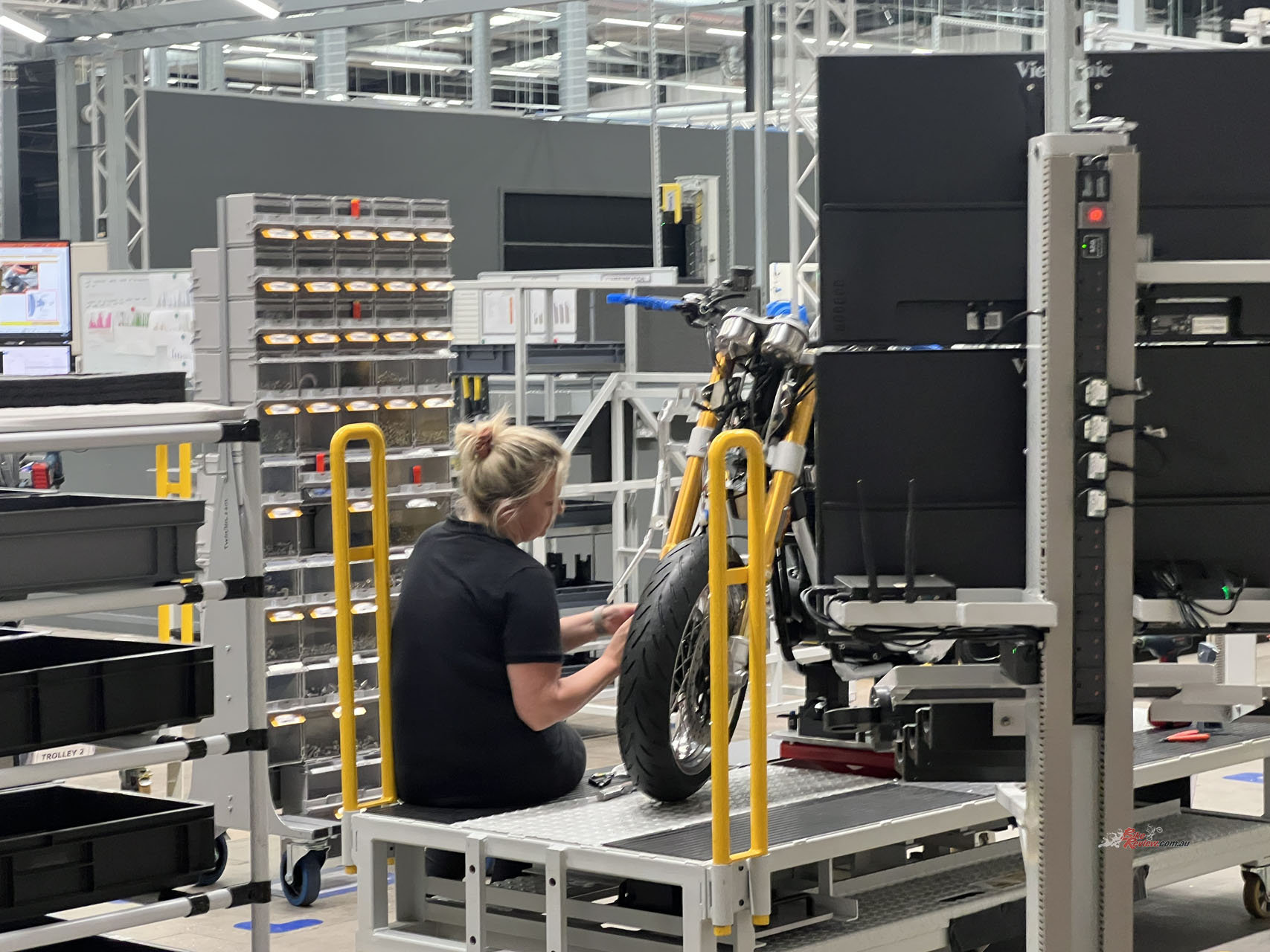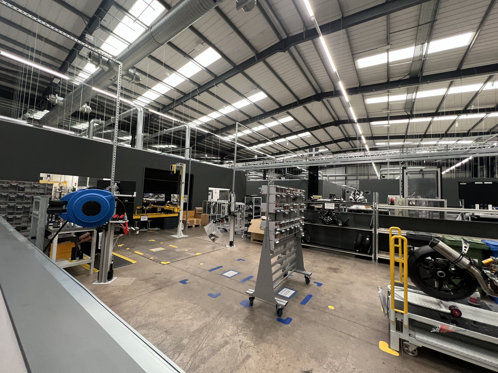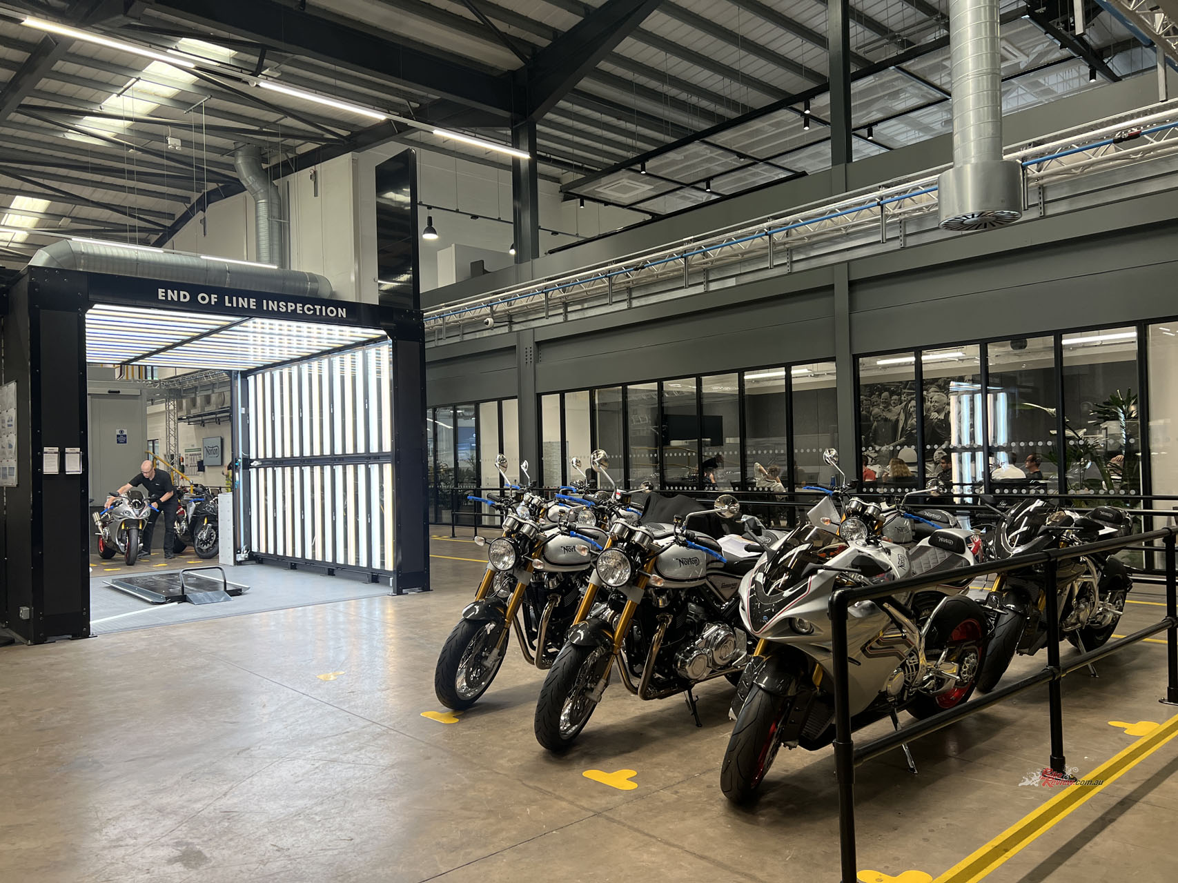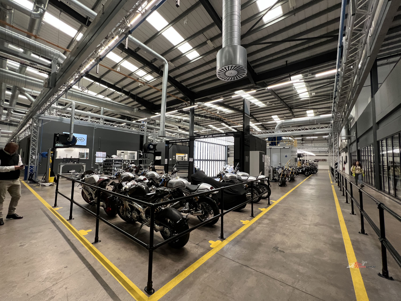 Walking into the factory, you’re met with state-of-the-art equipment and brand-new everything. The tour actually began at the end of the line inspection. Since these motorcycles go through a special scheme in the U.K., they’re subject to essentially what would be an ADR approval at the end of the line.