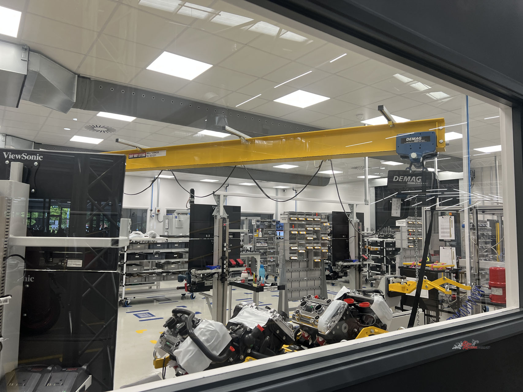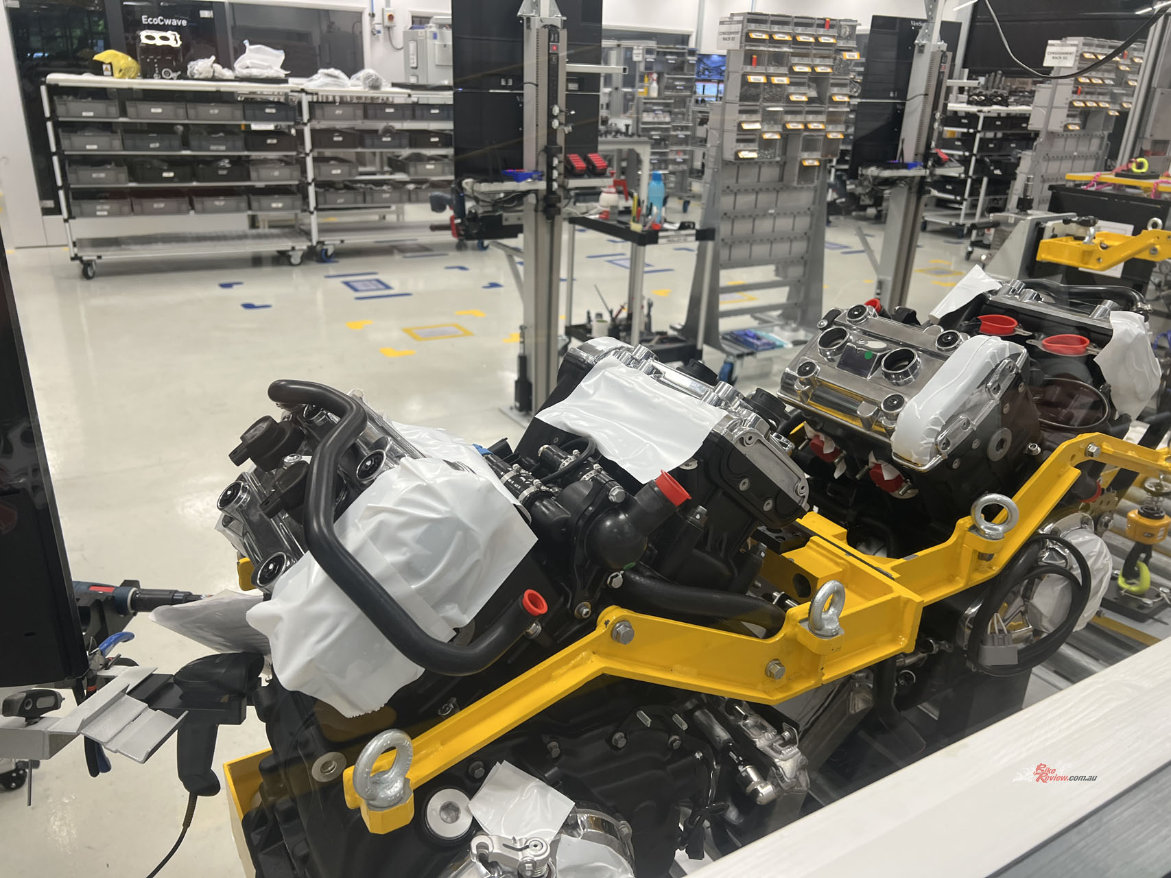 All the components go through an ultrasonic wash system to ensure they’re free of any microscopic particles that have been left behind in the manufacturing process. Then the engine builders assemble the engines with an “intelligent tooling system”, which helps get accurate torque specs and minimises human error greatly. The sealed engines then get processed out of the room, ready to be placed in one of those spectacular frames.