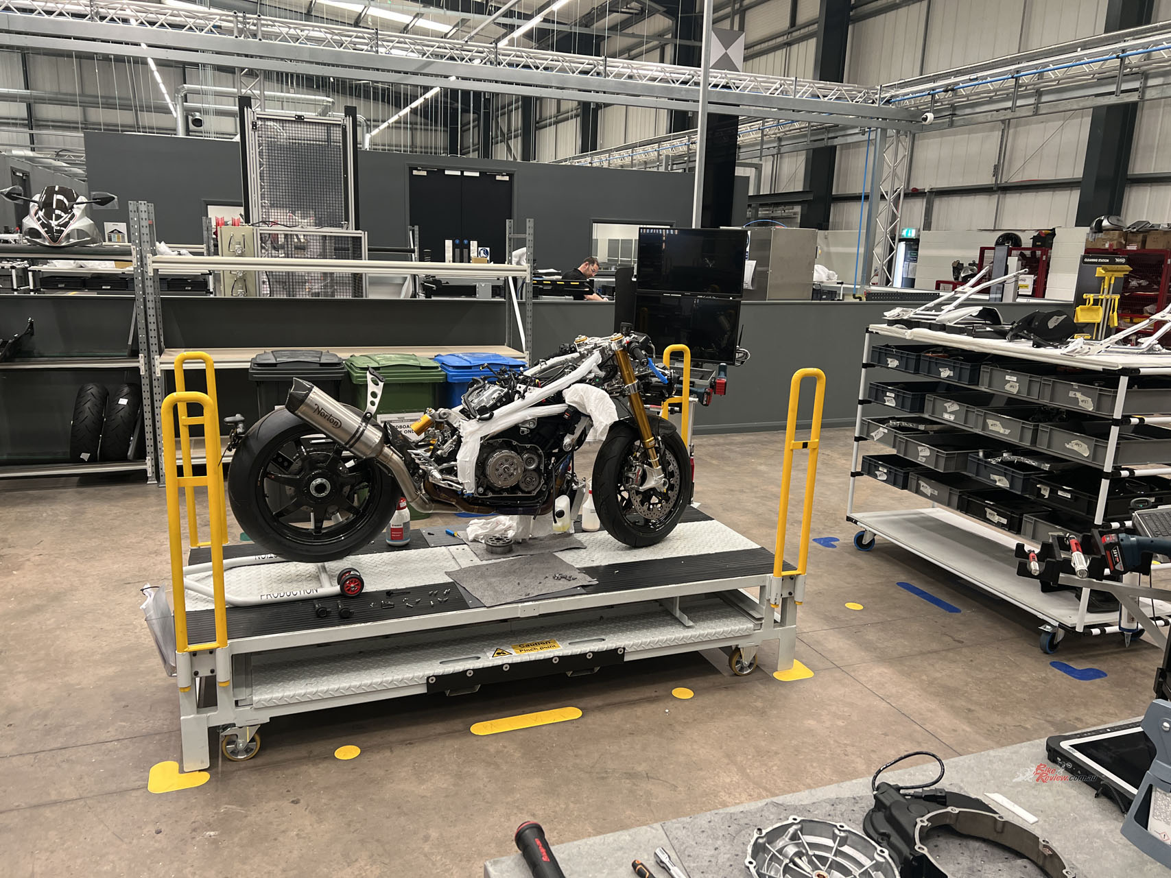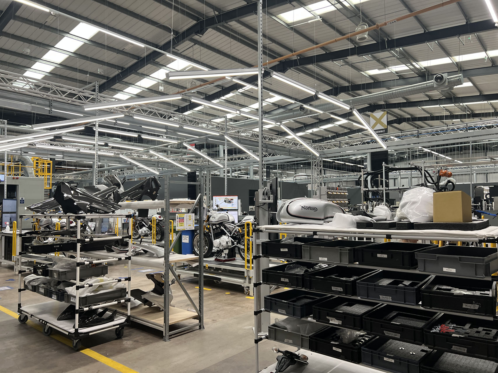 And so the opportunity arose for me to visit the multi-million Pound brand new building that TVS have built for the Norton brand out in Solihull. Just a mildly long train, bus, and walk from Birmingham, I arrive at the pearly gates of Norton. The bustling, large new factory shows no signs that it’s just come out of the rubble of previous ownership.