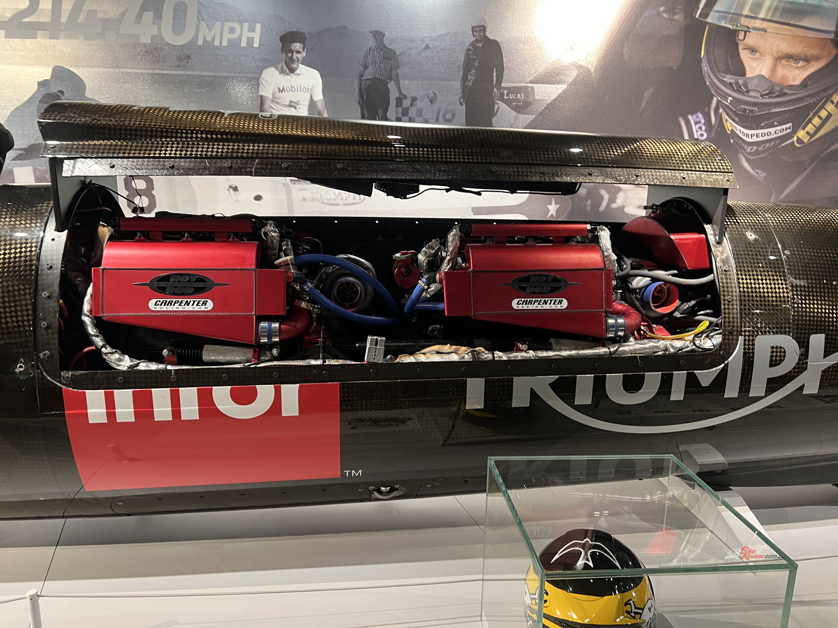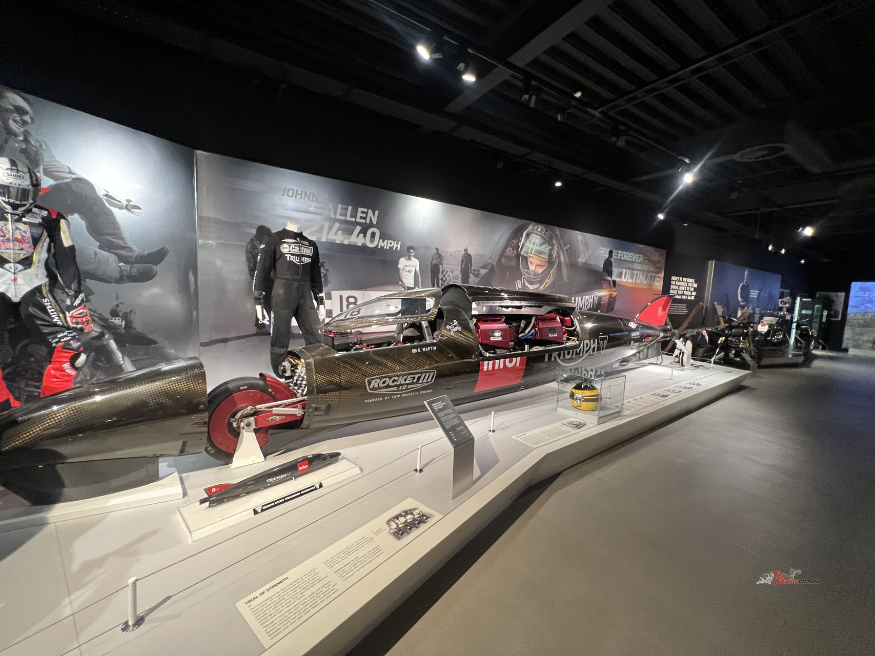 You make your way across to check out Triumph’s rich racing history, starting at the early Isle of Man TT machines and the current ones. Dominating the display downstairs is the massive 2015 Land Speed Rocket Streamliner and its massive turbos strapped to two methanol-fueled Rocket 3 engines! Making 1000hp and weighing only 816kg, this thing clocked in at 274mph during testing. However, it’s capable of 400mph+ but missed out on the opportunity due to poor salt flat conditions.