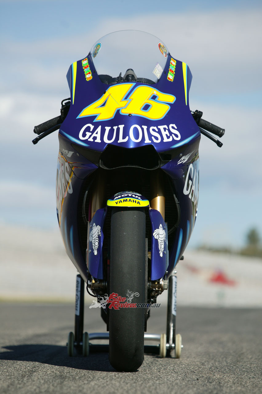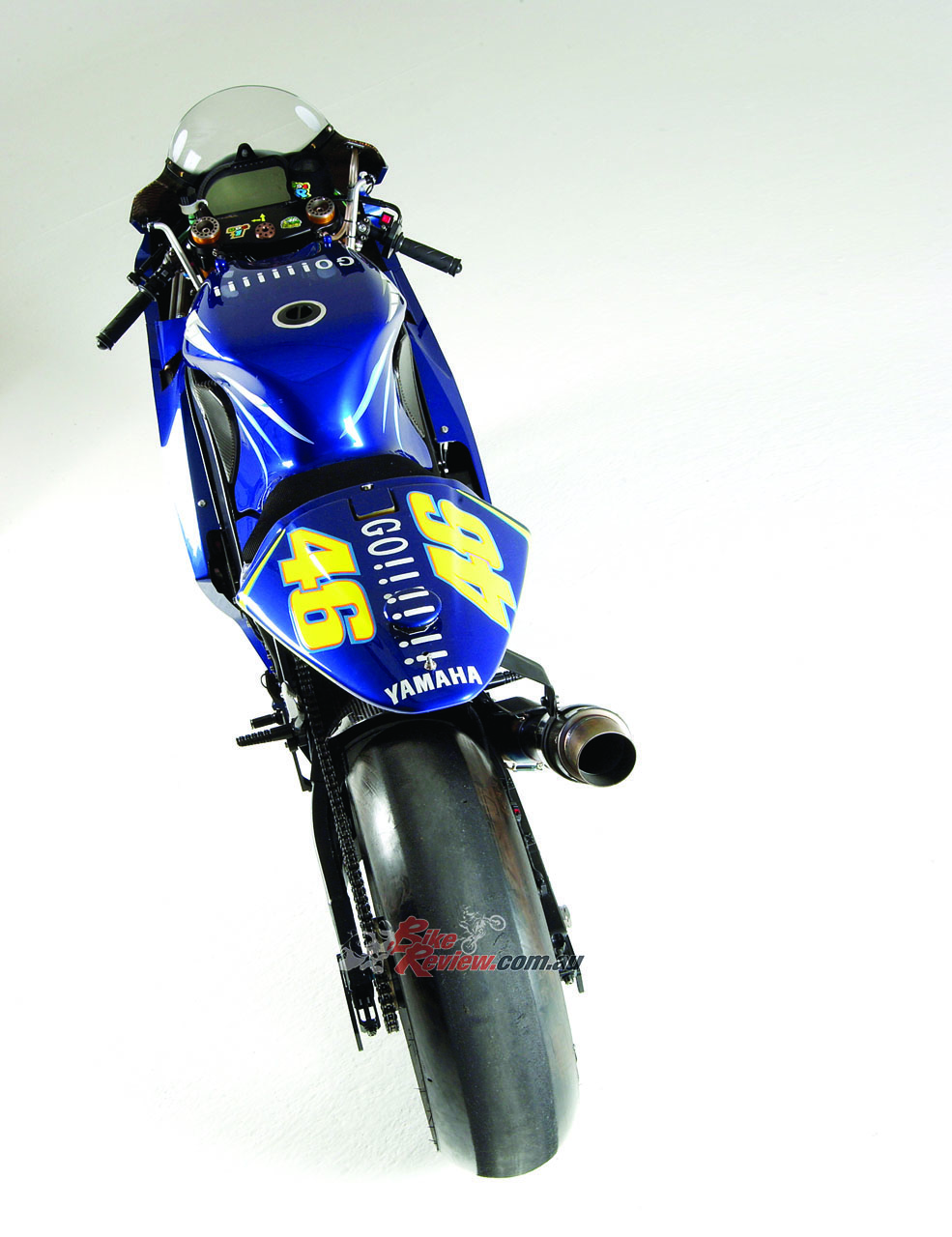 Yamaha’s aim in developing the YZF-M1 with its transverse in-line motor was to concentrate mass and reduce polar moment as much as possible, to achieve better balance in handling aimed at maximising corner speed, delivering more neutral handling, and improving traction so as to give the riders confidence to accelerate earlier and brake deeper into the turns, using the bigger footprint of Michelin’s new 16.5-inch front tyre introduced that season to optimum effect. Weight distribution was now 56/44 per cent static, but more importantly an even 50/50 split with a rider of Valentino’s weight in the hot seat – the optimum target to achieve the above objectives.