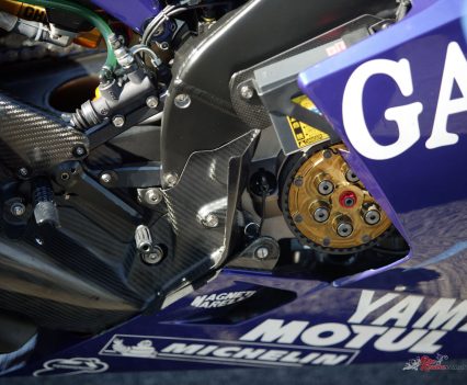 This originally allowed Yamaha to design a smaller, lighter Deltabox chassis, and while for 2003 this had 11 per cent more torsional rigidity than the first year’s frame, and 14 per cent pitching stiffness, while keeping lateral rigidity unchanged, as Furusawa-san revealed the latter was considerably decreased for 2004, to redress Valentino’s complaint that the bike was too stiff.