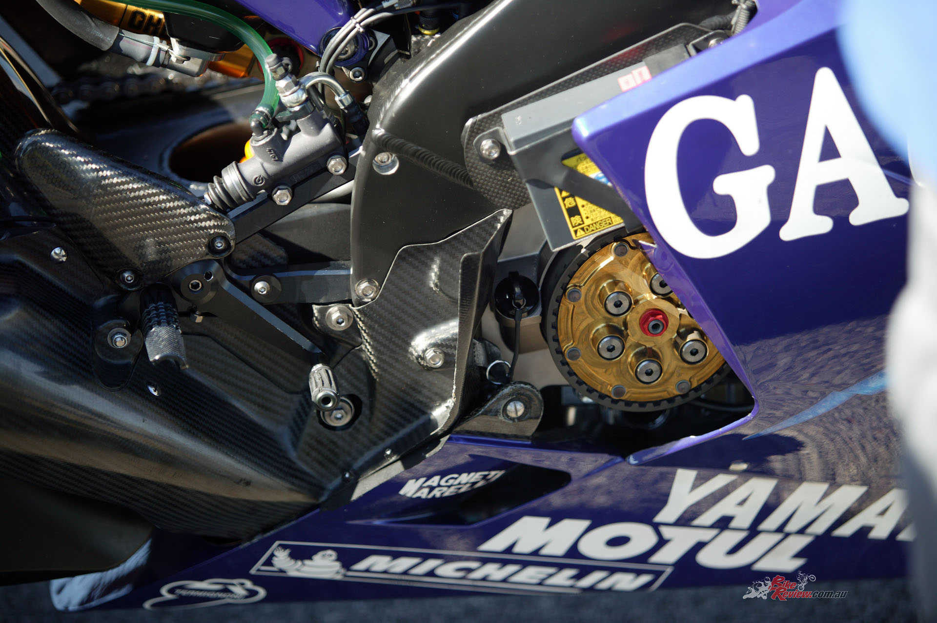 For 2004, what was previously a setup using preset engine mapping became a real-time system, which factored in tyre, weather and track conditions into the ICS kicker response. But the rider had to still use the clutch to backshift, because operating this triggered the system, which had also been considerably modified electronically from 2003, to give more feel. And further electronic control was supplied via traction control, which Yamaha employed off the start line, then again in the race if the rear tyre lost grip, when the rider could select a different map with less aggressive characteristics via a switch on the left handlebar.