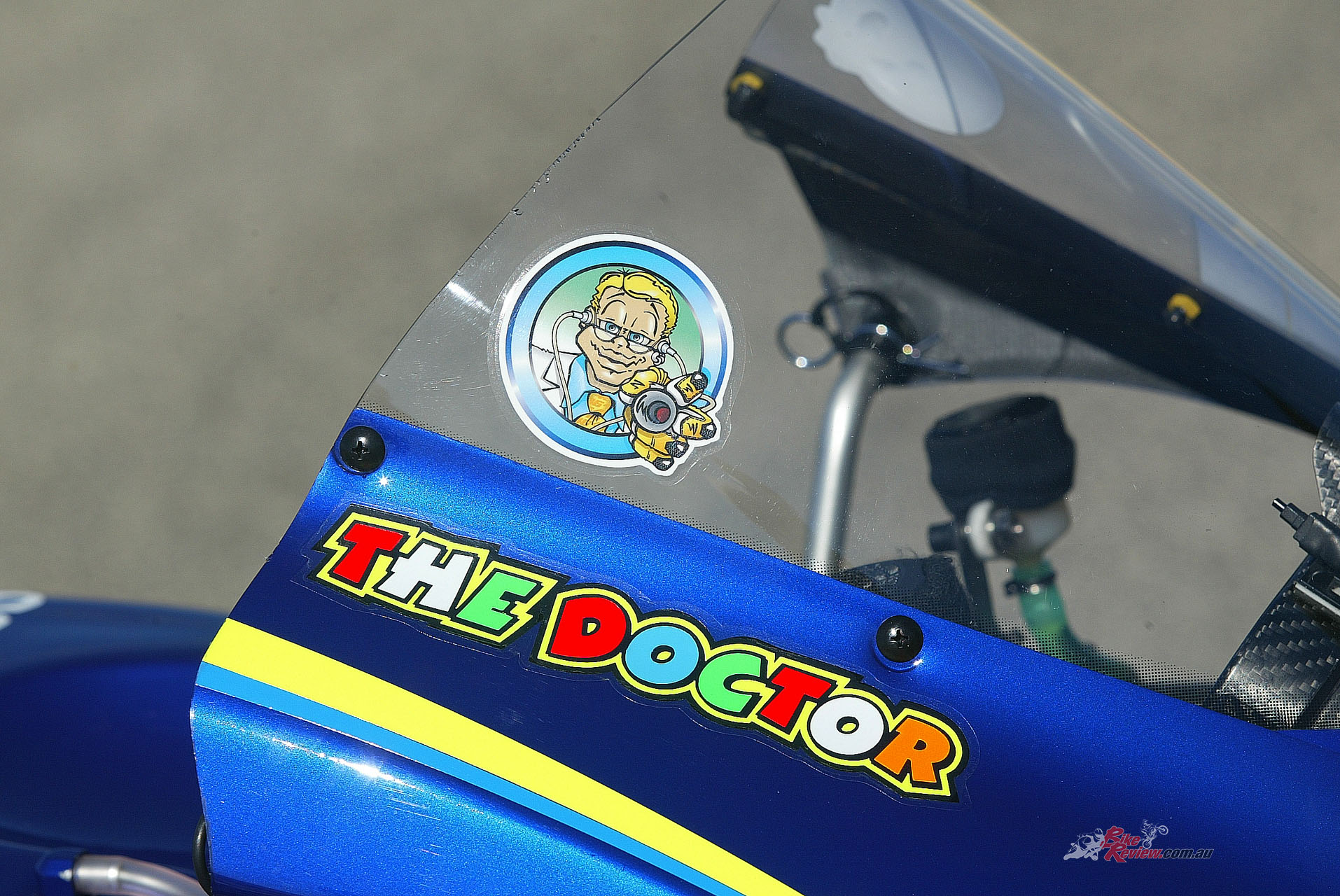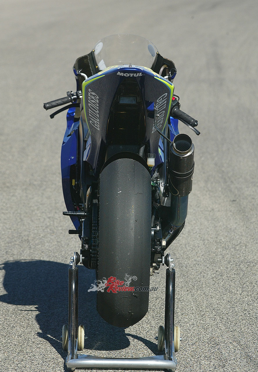 The prototype of the 2004 chassis first appeared at Valencia in 2003, with new upper engine mounts on the base of the cylinder block, rather than the cylinder head, and a reversed fully-machined swingarm with bracing underneath rather than above, to lower the cee of gee. But the bike was nevertheless raised 25mm overall for Rossi by the time he raced it for the first time in Welkom, and had also been lengthened by 20mm.