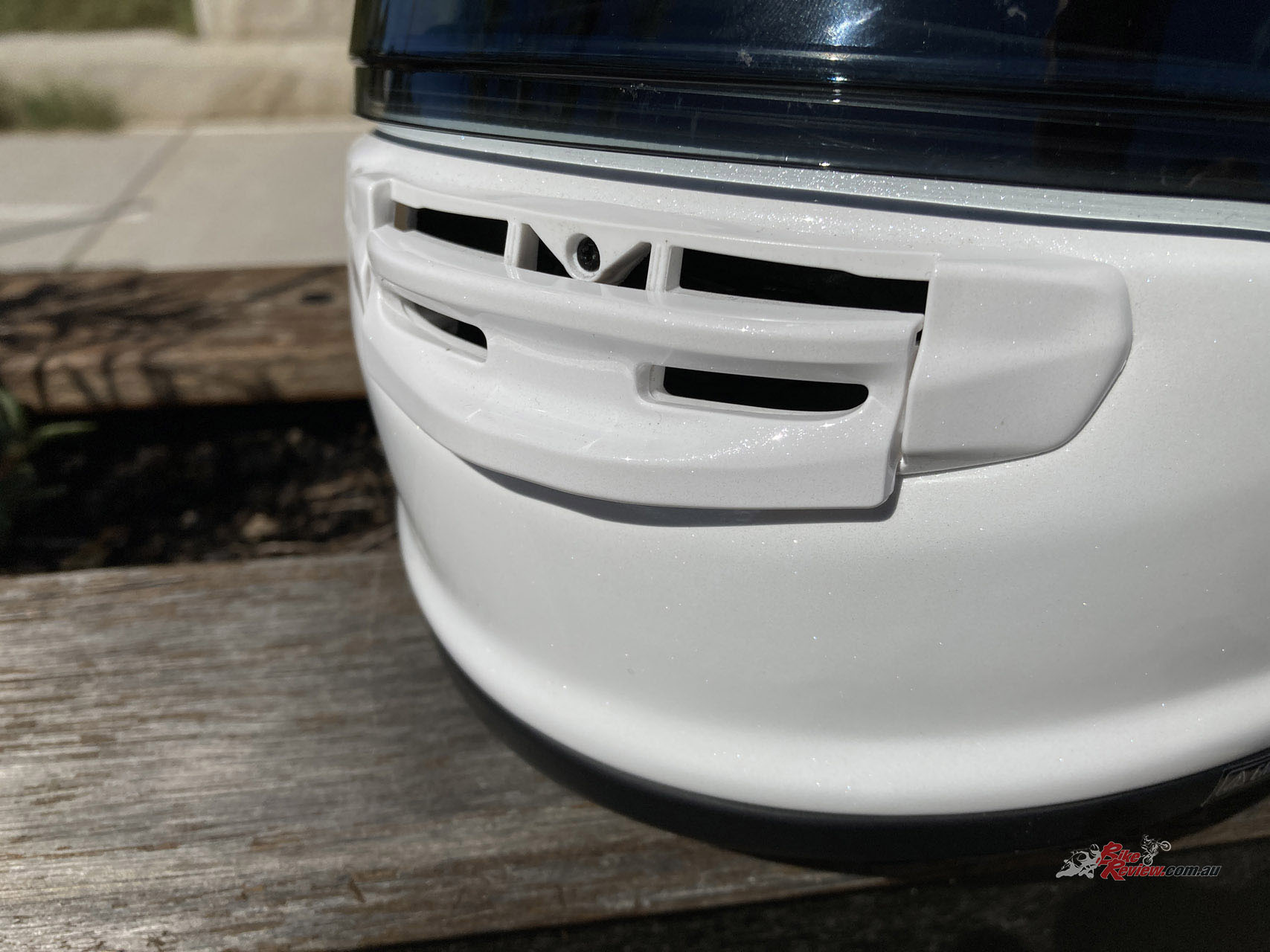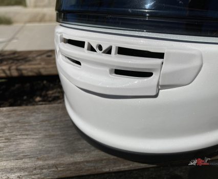 Also new is the 3-position (open, midway and closed) sliding air-scoop chin vent which flows a larger intake volume of air and has a replaceable filter. The actuating mechanism is thicker and easy to use with gloves.