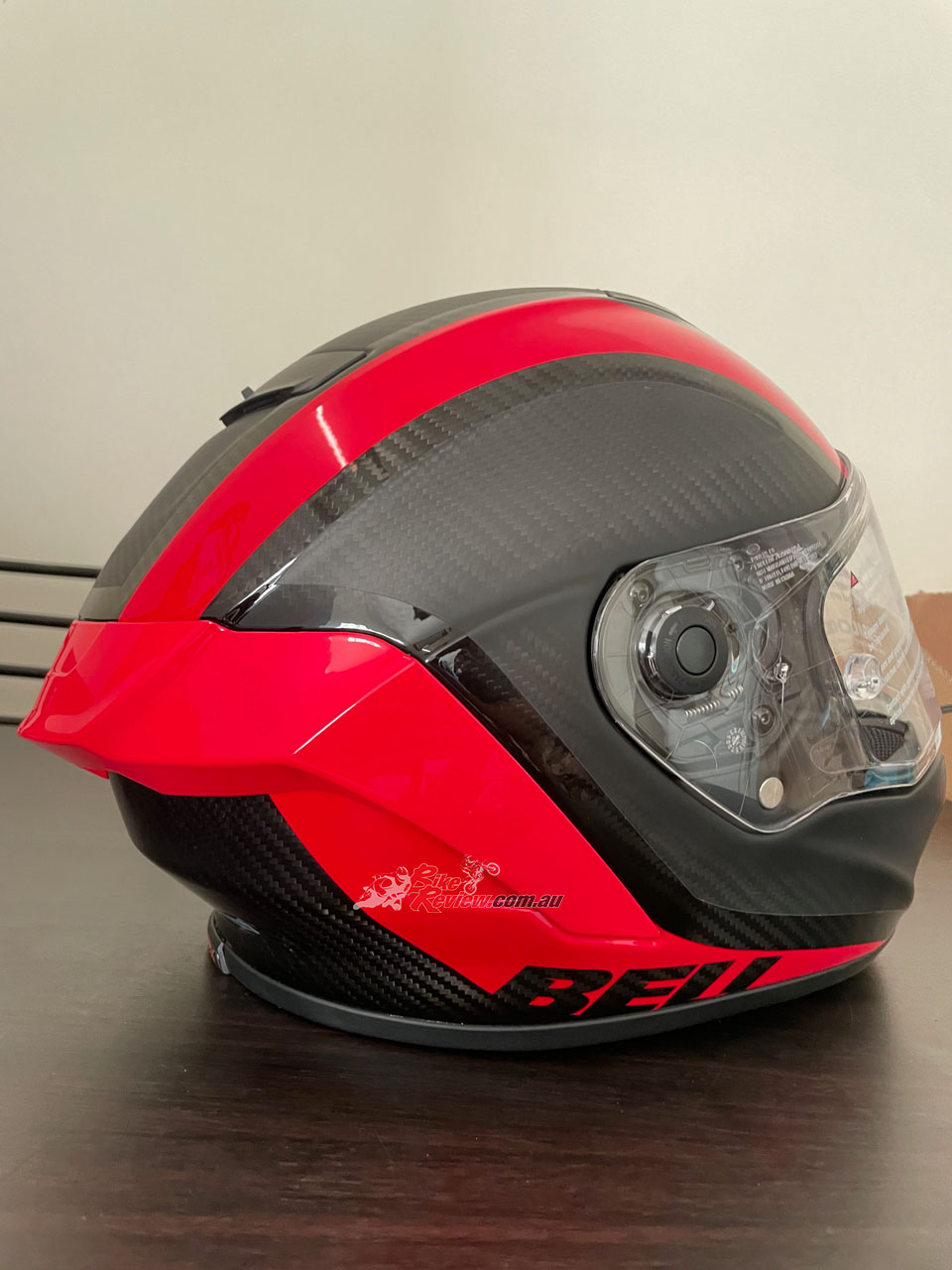 I absolutely love this helmet! The red and black version I received not only works the carbon fibre look but fits beautifully with the shape especially looking at the rear of the lid… it’s impressive. The slipstream fin makes the rider look serious and judging by the concave in the shell running to the fin its clear Bell know their aerodynamics.