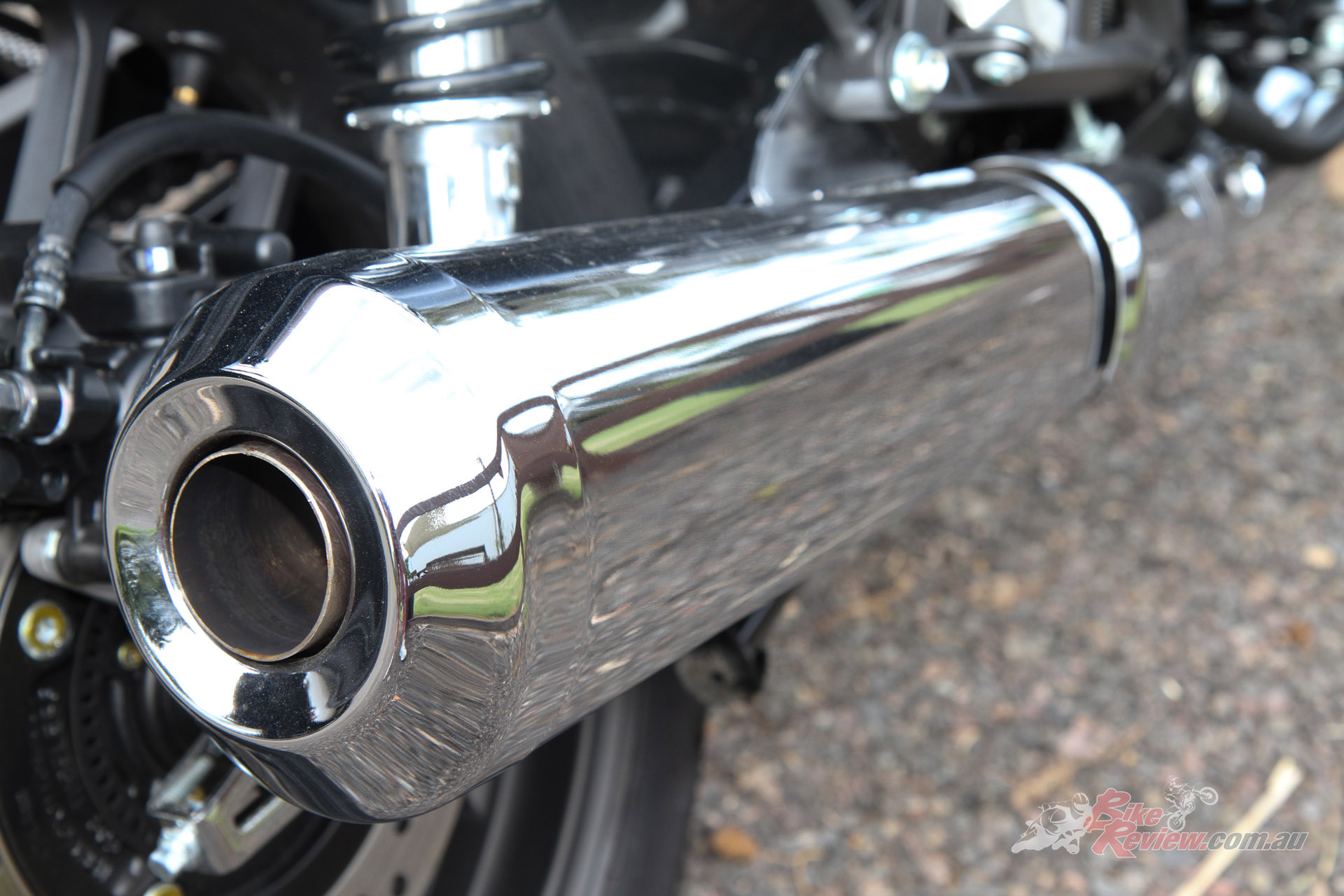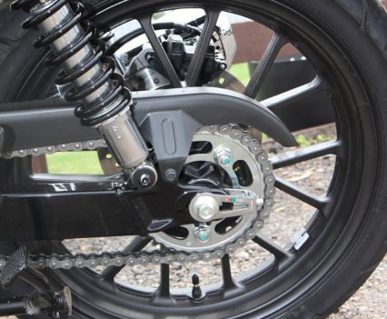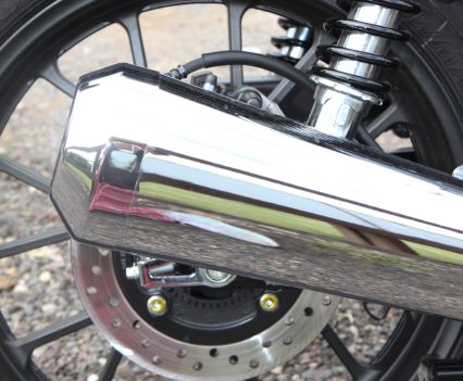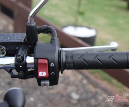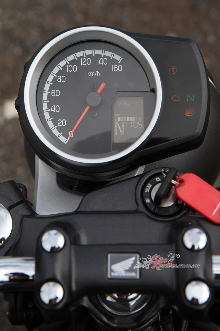 The rider triangle is also natural and comfortable, with the wide chrome handlebars having a nice bend, while offering that retro look, and the tank shape sits well between the knees. I do reckon that the offset dash LCD display area is a bit hard to see and read in certain light, but the speedo, which is analogue style, is fine. The exhaust note is really good for a standard pipe, a proper thump to it, I enjoyed that.