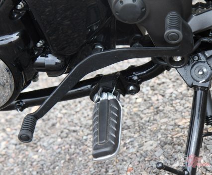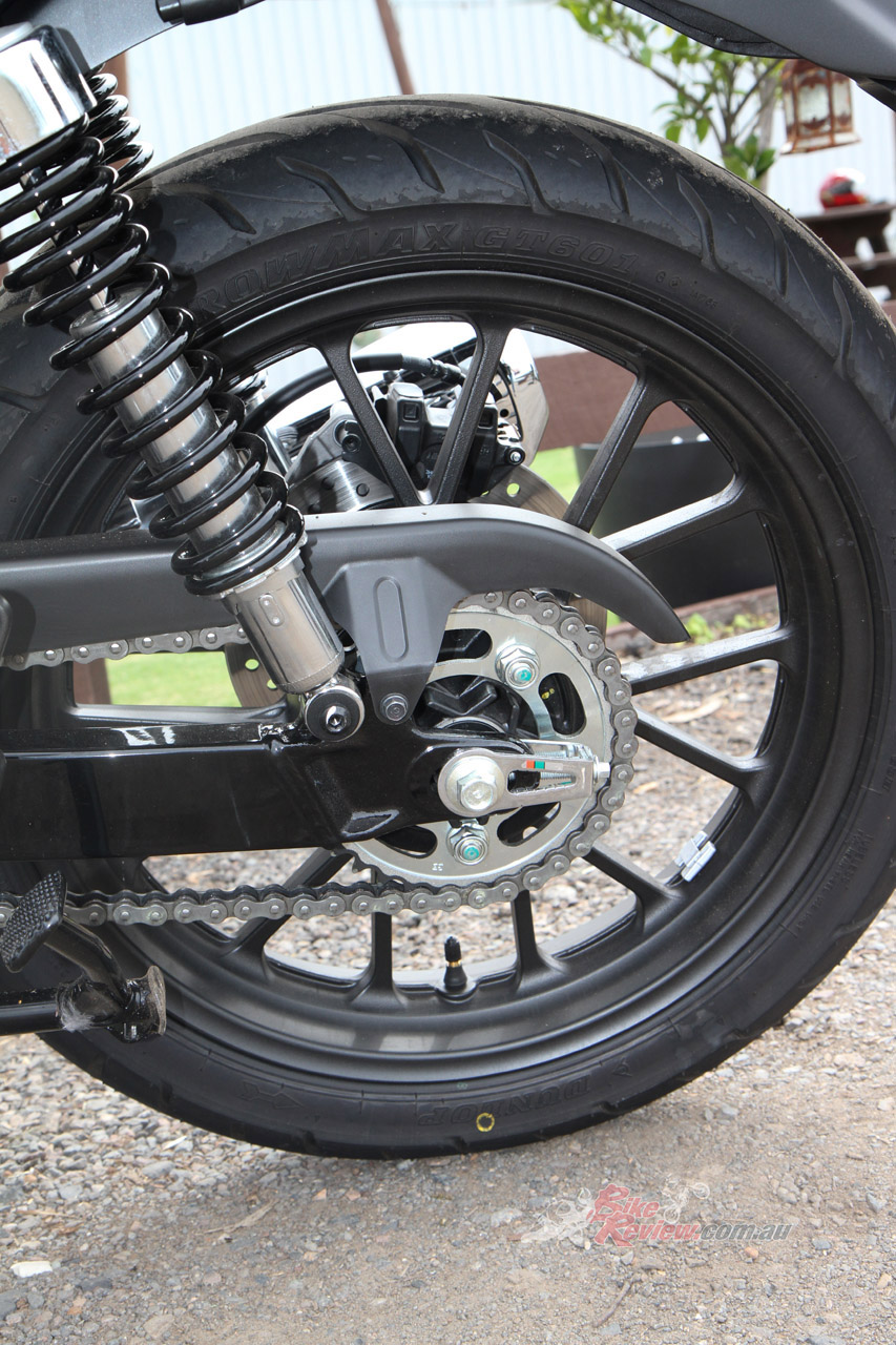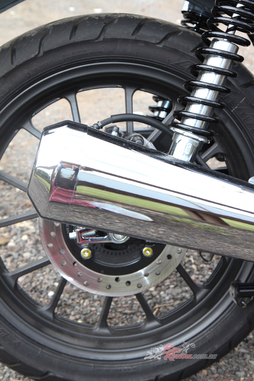 The retro theme extends to the wheel sizes, a 19in front and 18in rear, wearing skinny 100/90 – 19 and 130/70 – 18in Dunlop Arrowmax GT601 tyres. The wide, long, brown leather-look seat height is an accessible 800mm, there is a handy centre-stand, large pillion footpegs and a pillion grab rail, a decent sized 15L fuel tank (giving a potential range of well over 500km), and weight is reasonable at 181kg. The front brake is a 310mm rotor with a two-piston sliding Nissin caliper, while at the back is a single 240mm rotor, oversized, something again popular in many SE Asian markets.