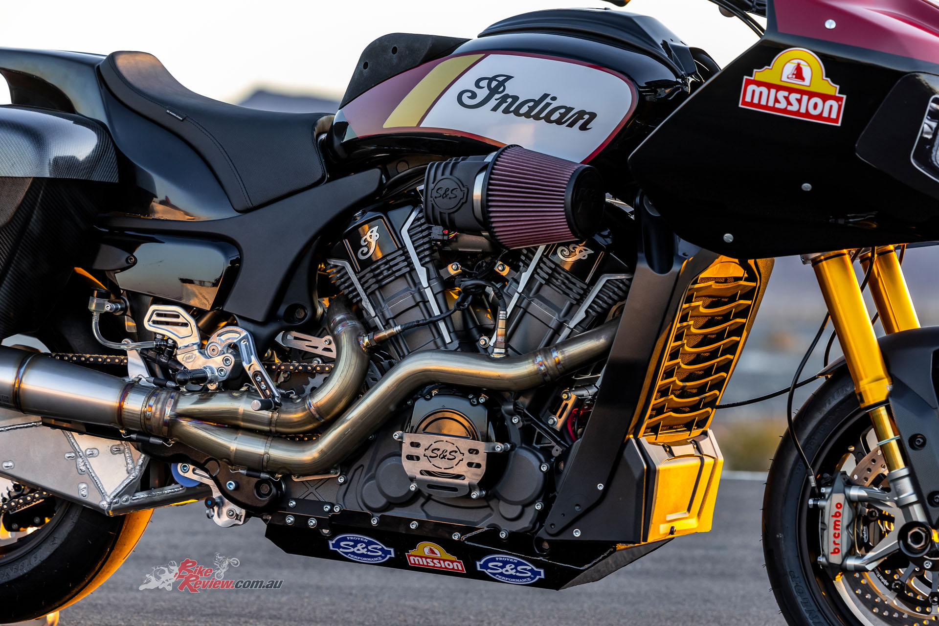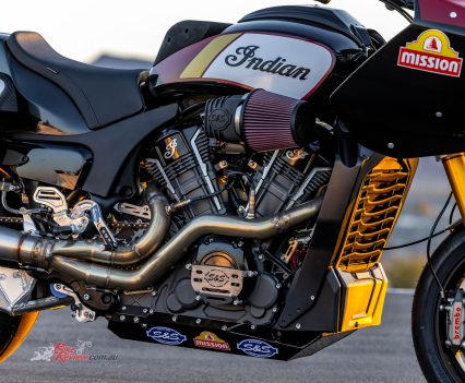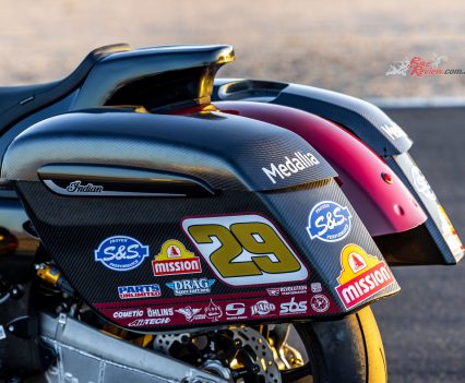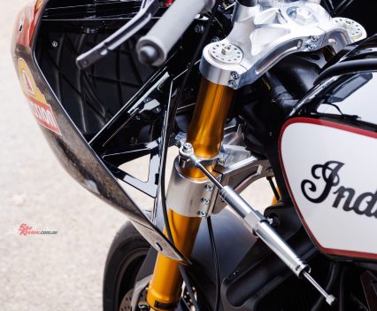 For long it certainly is, as despite the stock cast aluminium swingarm being retained (albeit heavily braced), Bailey says the Indian must be run as short as possible owing to the conversion to chain final drive from the stock Challenger’s Gates belt, complete with a jockey wheel added to maintain required tension. “The Öhlins TTX36 rear suspension works better with the shorter swingarm, even if for overall vehicle dynamics longer is better, so as to get more weight onto the front wheel,” he says. “But we’re now running the bikes as short as possible, because we can work out the chain run and gearing better.”